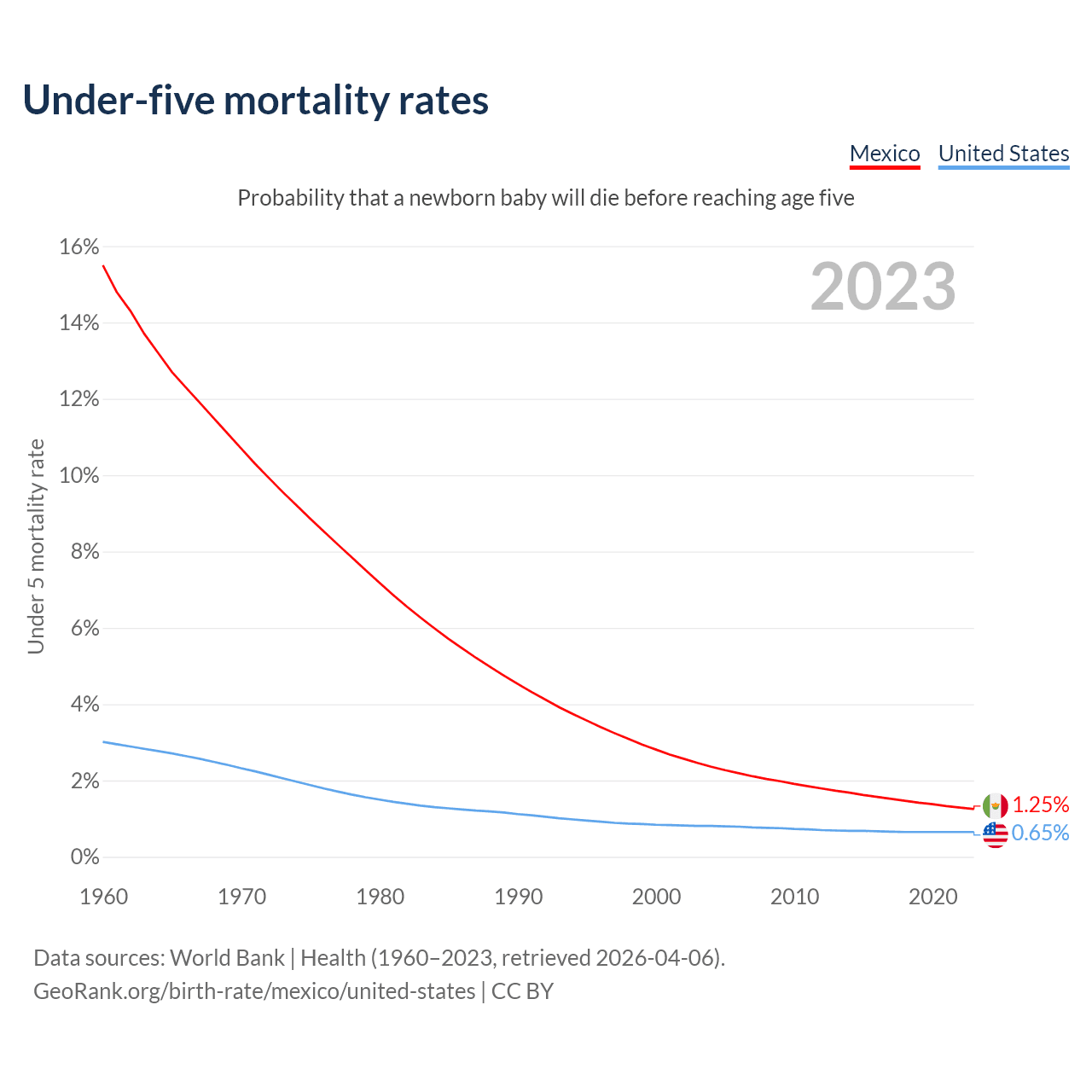 The chance that a newborn baby will die before reaching age five is 1.25% in Mexico and 0.65% in the United States. Above is a chart with historical data on under-five mortality rates.