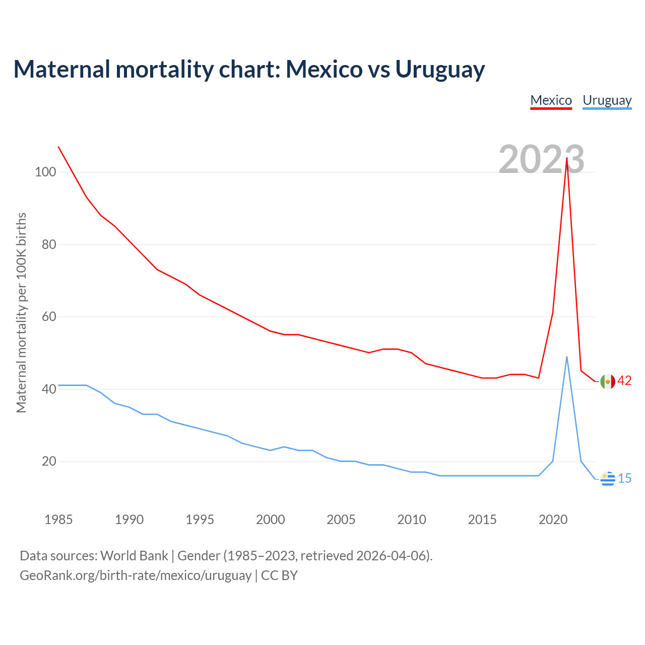 The maternal mortality rate, which is the probability of dying during childbirth or within 42 days of pregnancy termination, is 42 deaths per 100,000 live births in Mexico, compared to 15 deaths in Uruguay.