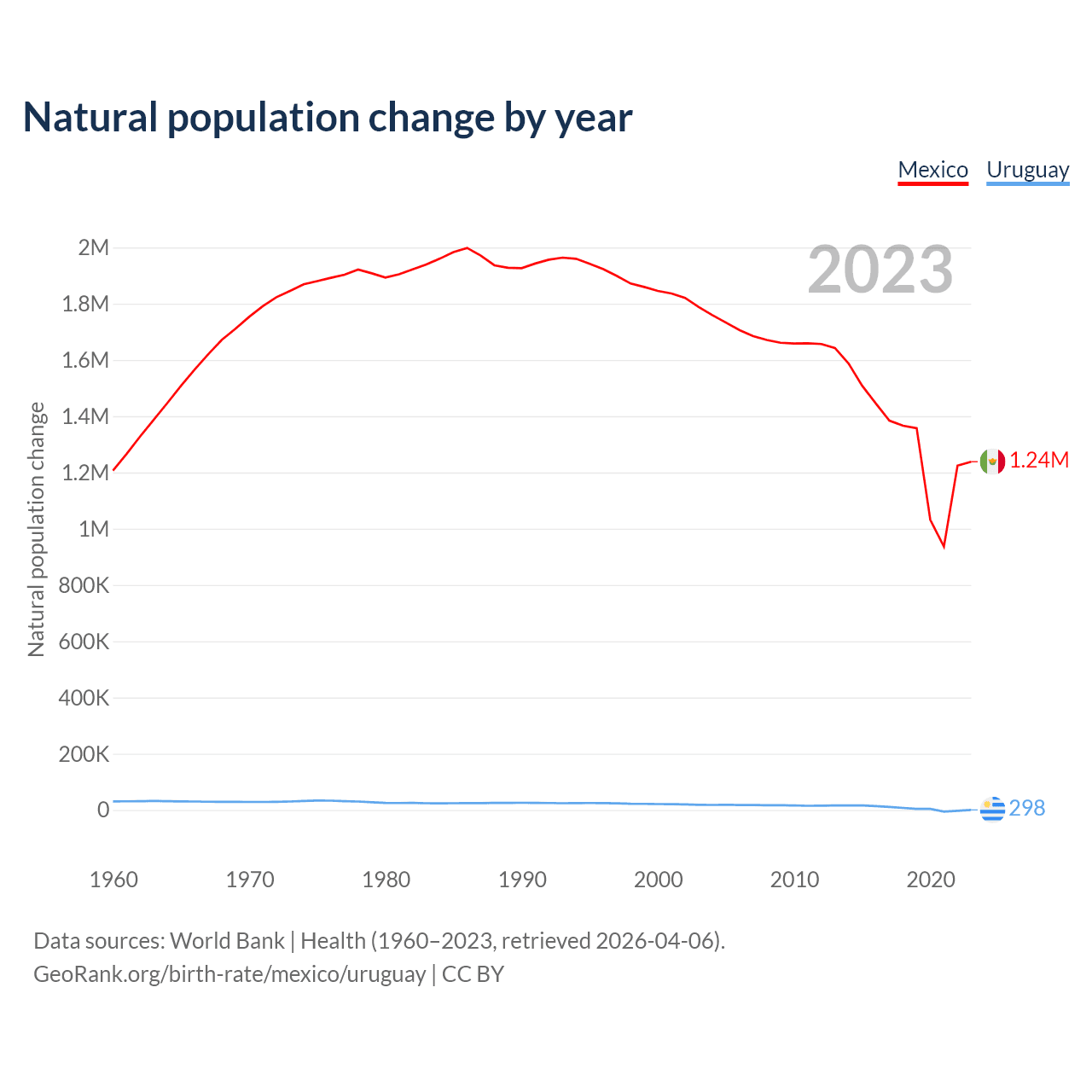 According to the latest available data on birth rates, the fertility rate in Mexico was 1.91 children per woman in 2023, compared to 1.41 in Uruguay in 2023. The replacement level is considered to be 2.1 children per woman.