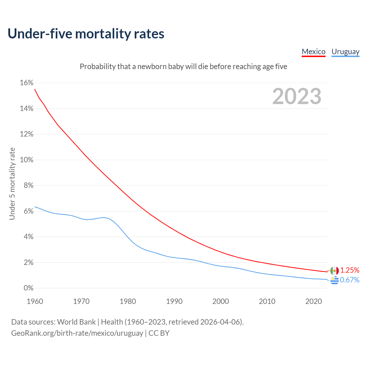 The chance that a newborn baby will die before reaching age five is 1.25% in Mexico and 0.67% in Uruguay. Above is a chart with historical data on under-five mortality rates.