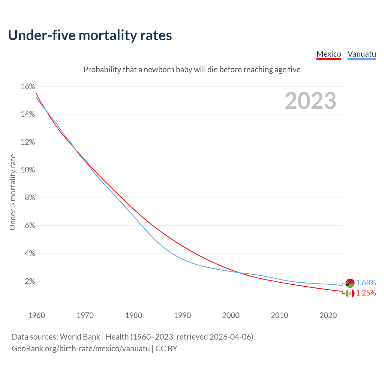 The chance that a newborn baby will die before reaching age five is 1.25% in Mexico and 1.68% in Vanuatu. Above is a chart with historical data on under-five mortality rates.