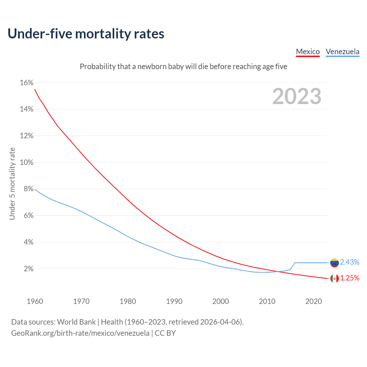 The chance that a newborn baby will die before reaching age five is 1.25% in Mexico and 2.43% in Venezuela. Above is a chart with historical data on under-five mortality rates.
