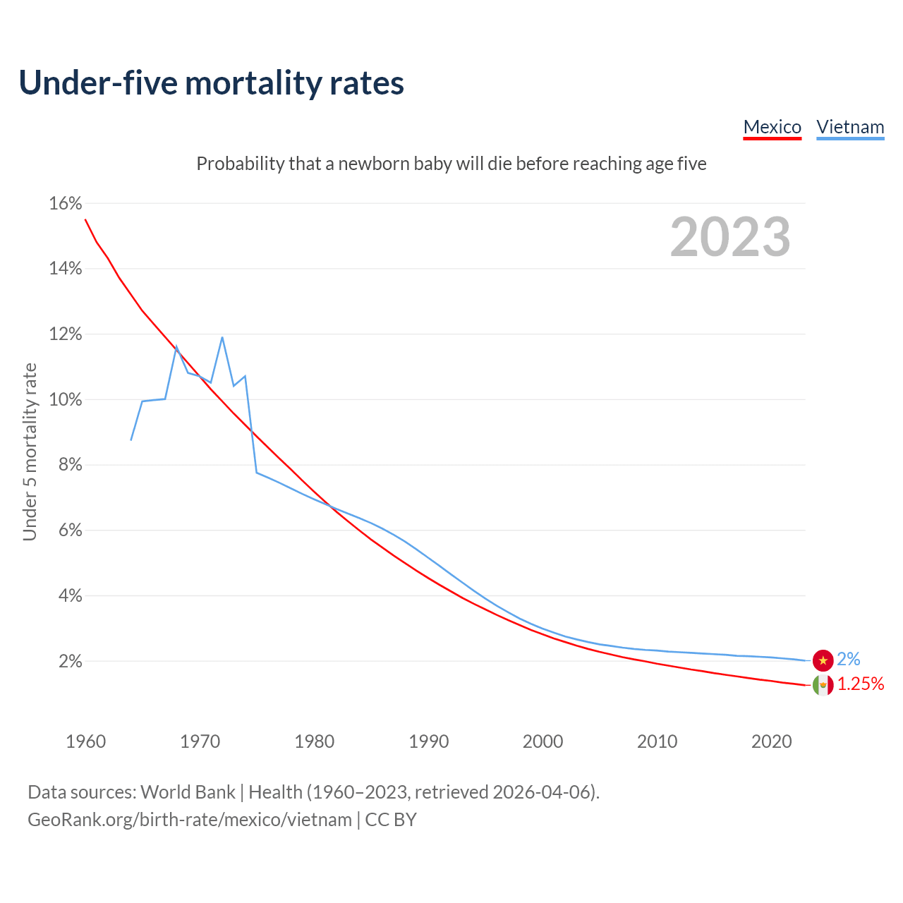 The chance that a newborn baby will die before reaching age five is 1.25% in Mexico and 2% in Vietnam. Above is a chart with historical data on under-five mortality rates.