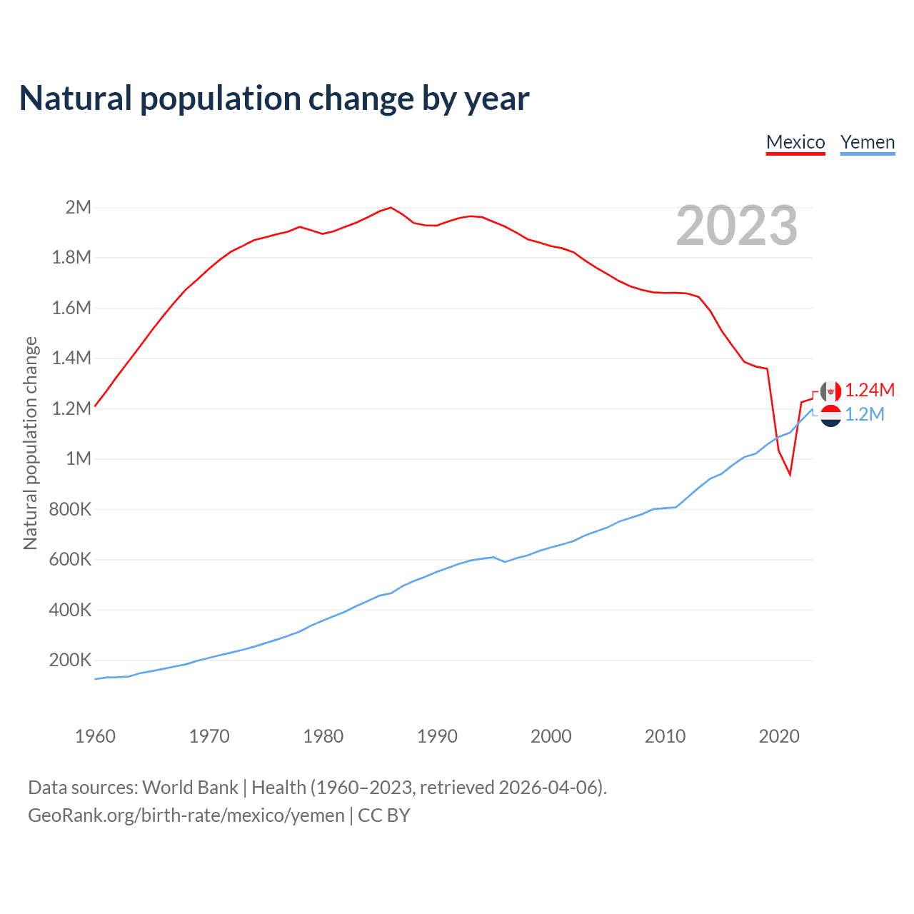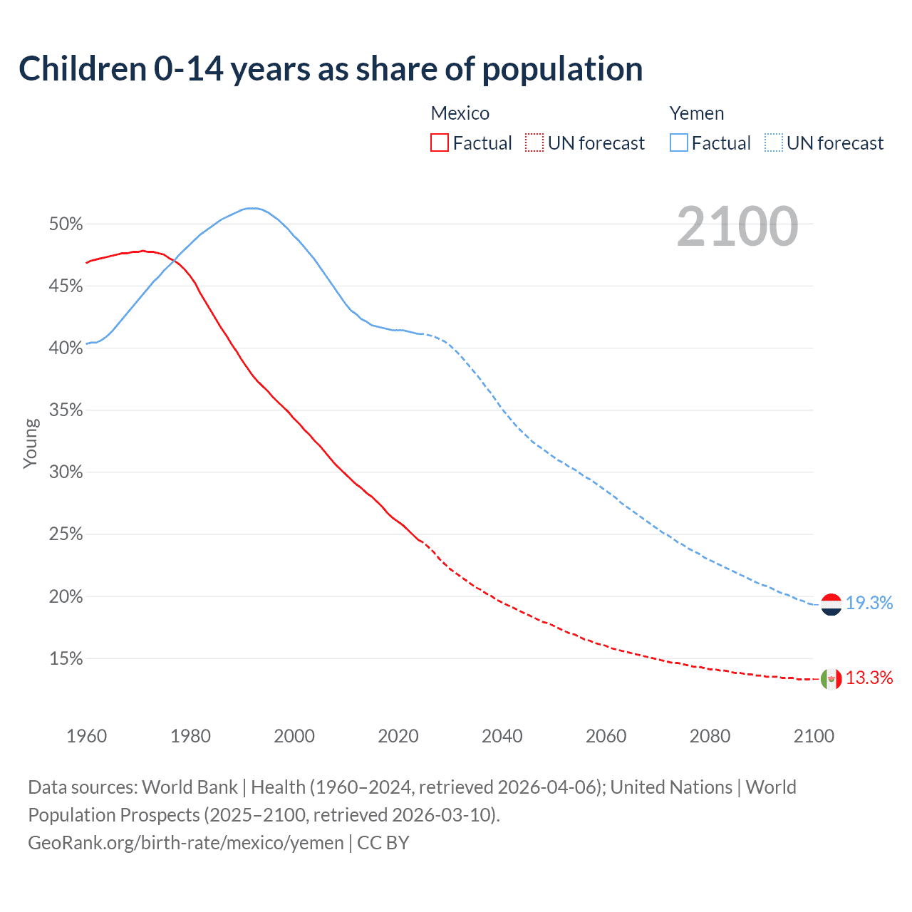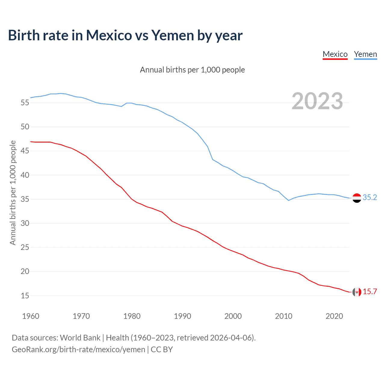 Mexico has an annual birth rate of 15.7 births per 1,000 people, compared to 35.2 for Yemen. The average number of children a woman is expected to have during her lifetime — the fertility rate, is 1.91 in Mexico and 4.59 in Yemen — 140.3% difference.