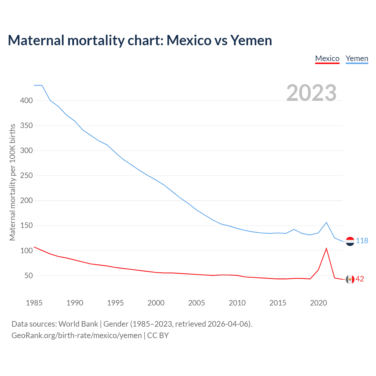The maternal mortality rate, which is the probability of dying during childbirth or within 42 days of pregnancy termination, is 42 deaths per 100,000 live births in Mexico, compared to 118 deaths in Yemen.