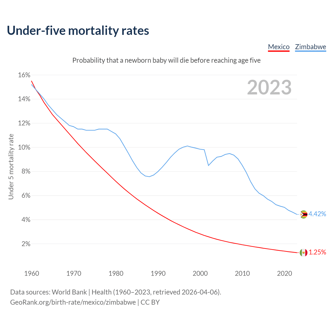 The chance that a newborn baby will die before reaching age five is 1.25% in Mexico and 4.42% in Zimbabwe. Above is a chart with historical data on under-five mortality rates.