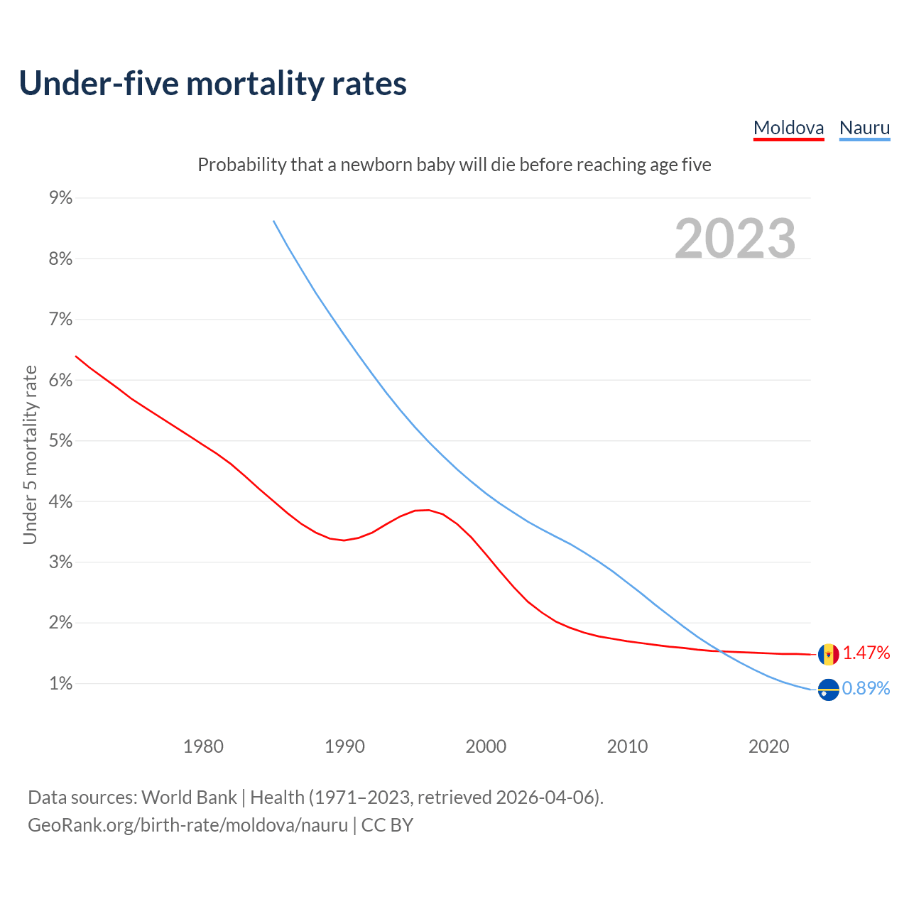 The chance that a newborn baby will die before reaching age five is 1.47% in Moldova and 0.89% in Nauru. Above is a chart with historical data on under-five mortality rates.