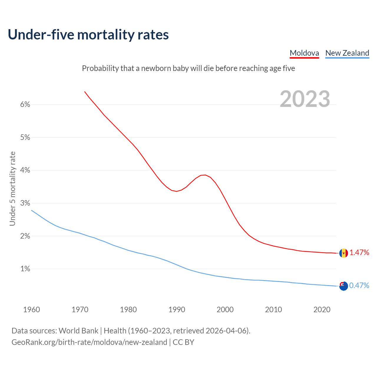The chance that a newborn baby will die before reaching age five is 1.47% in Moldova and 0.47% in New Zealand. Above is a chart with historical data on under-five mortality rates.