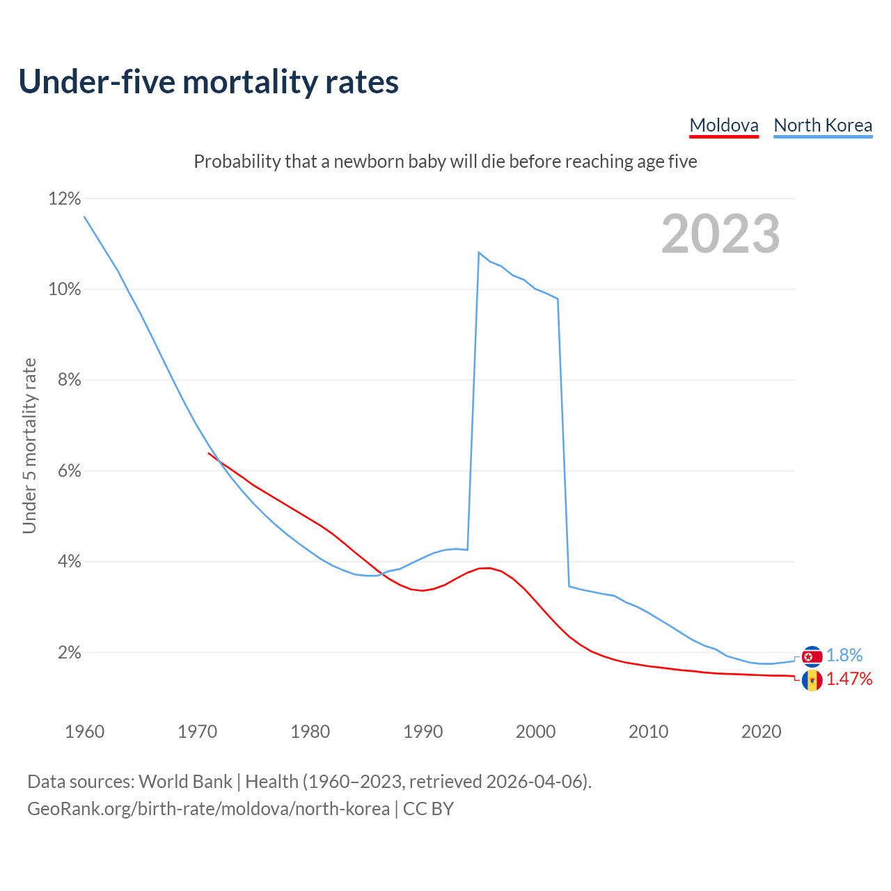 The chance that a newborn baby will die before reaching age five is 1.47% in Moldova and 1.8% in North Korea. Above is a chart with historical data on under-five mortality rates.