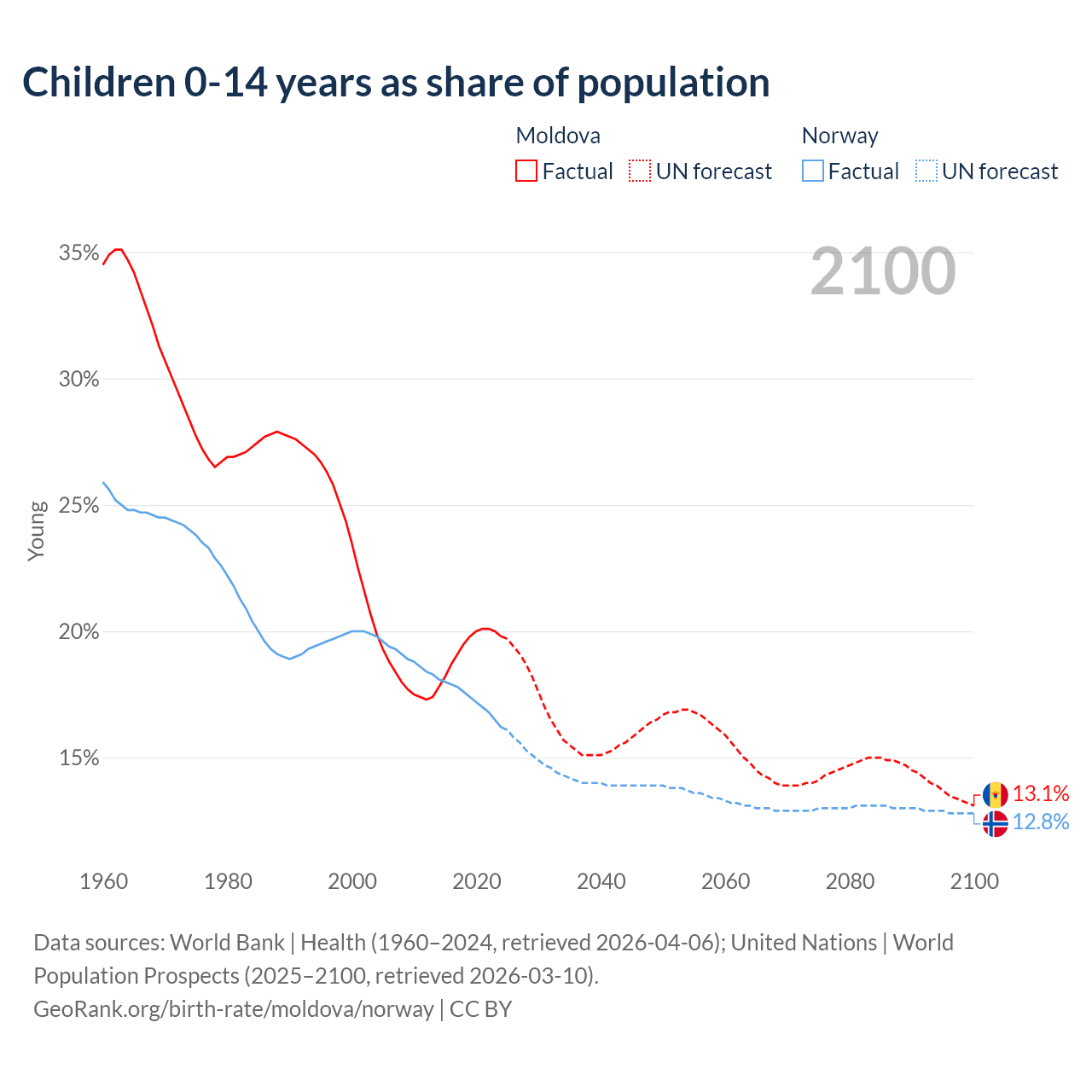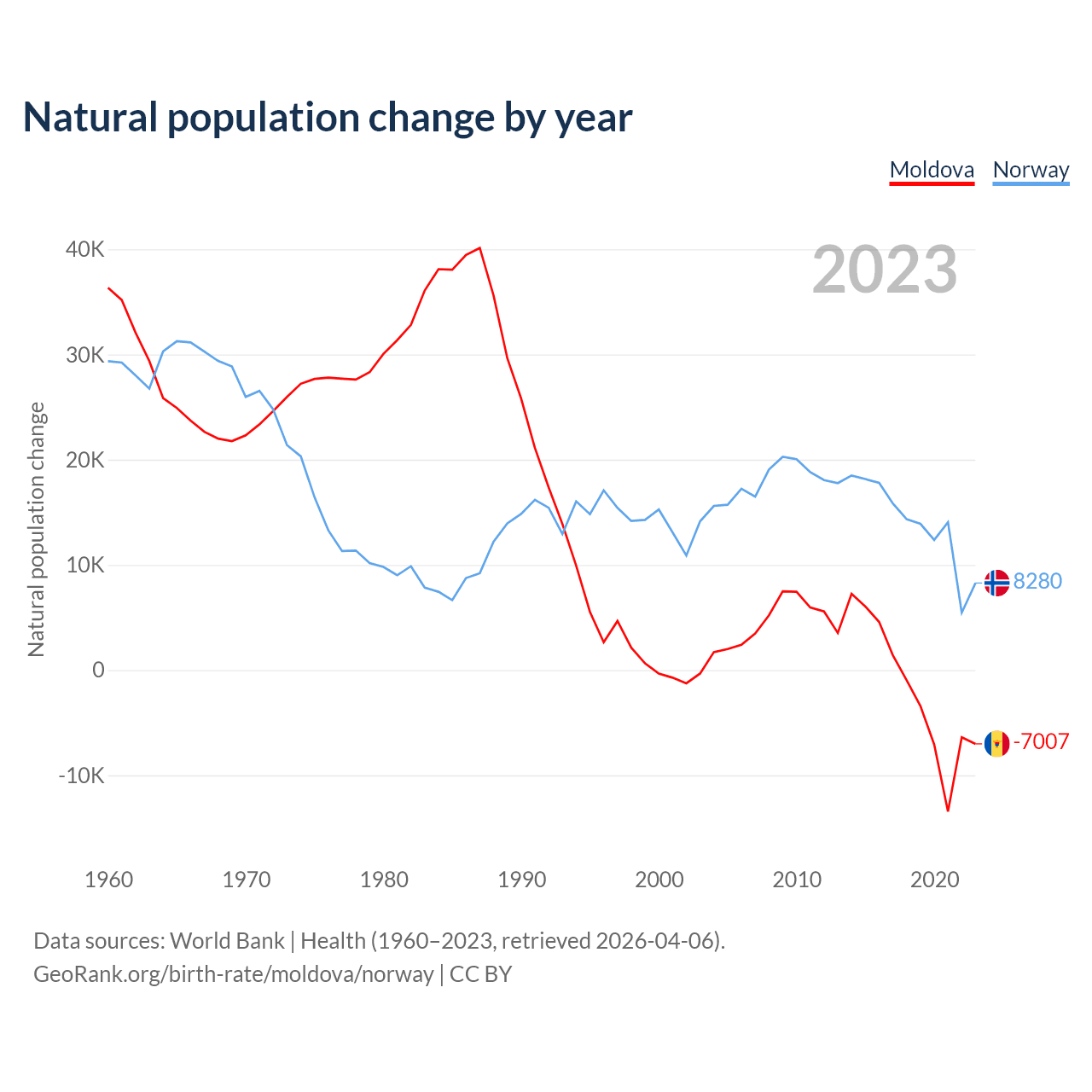 According to the latest available data on birth rates, the fertility rate in Moldova was 1.73 children per woman in 2023, compared to 1.4 in Norway in 2023. The replacement level is considered to be 2.1 children per woman.