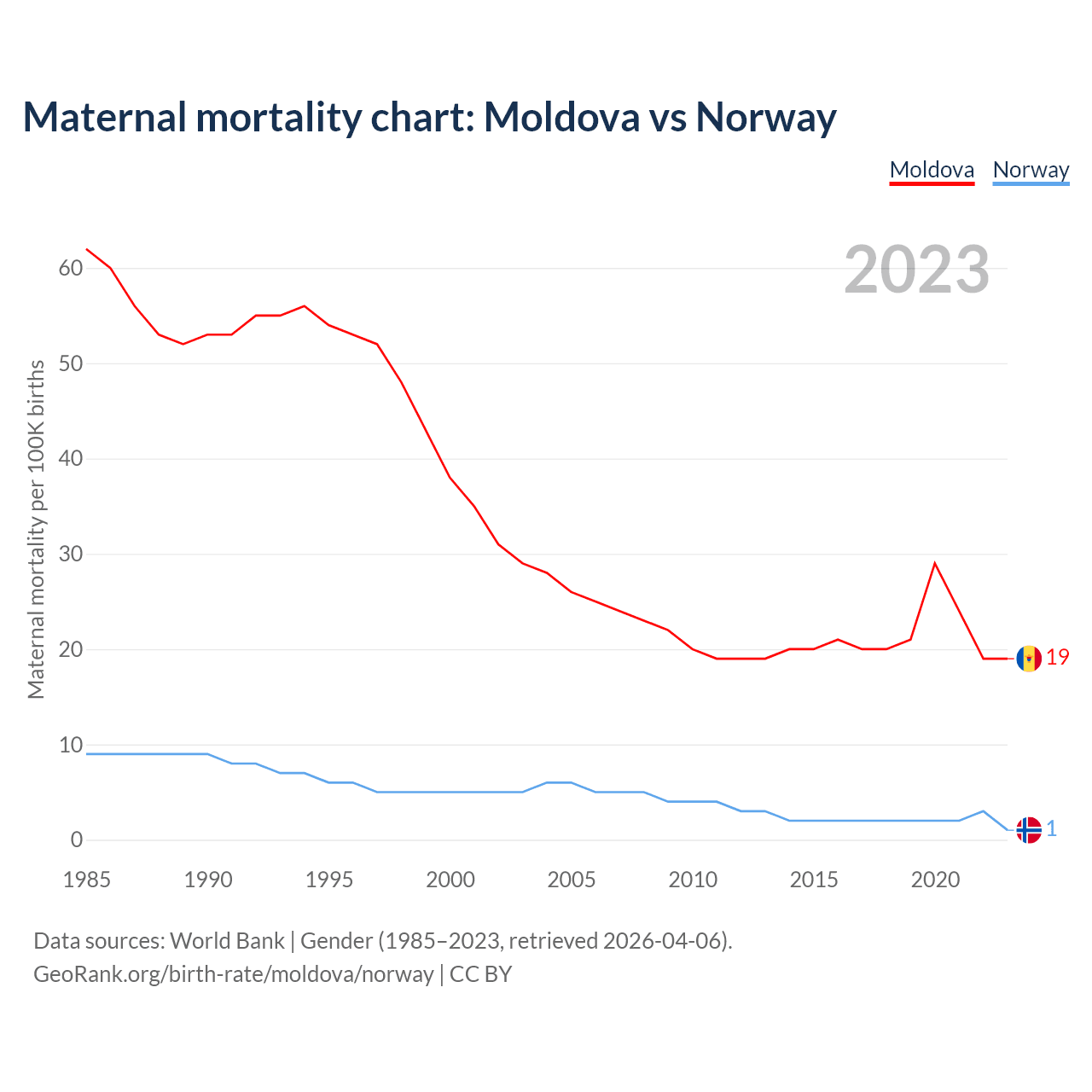 The maternal mortality rate, which is the probability of dying during childbirth or within 42 days of pregnancy termination, is 19 deaths per 100,000 live births in Moldova, compared to 1 deaths in Norway.