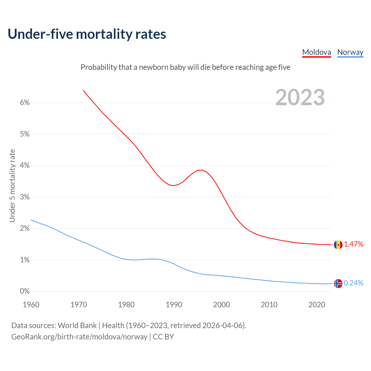 The chance that a newborn baby will die before reaching age five is 1.47% in Moldova and 0.24% in Norway. Above is a chart with historical data on under-five mortality rates.