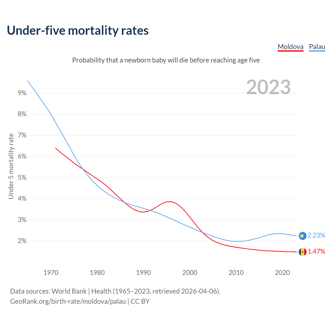 The chance that a newborn baby will die before reaching age five is 1.47% in Moldova and 2.23% in Palau. Above is a chart with historical data on under-five mortality rates.