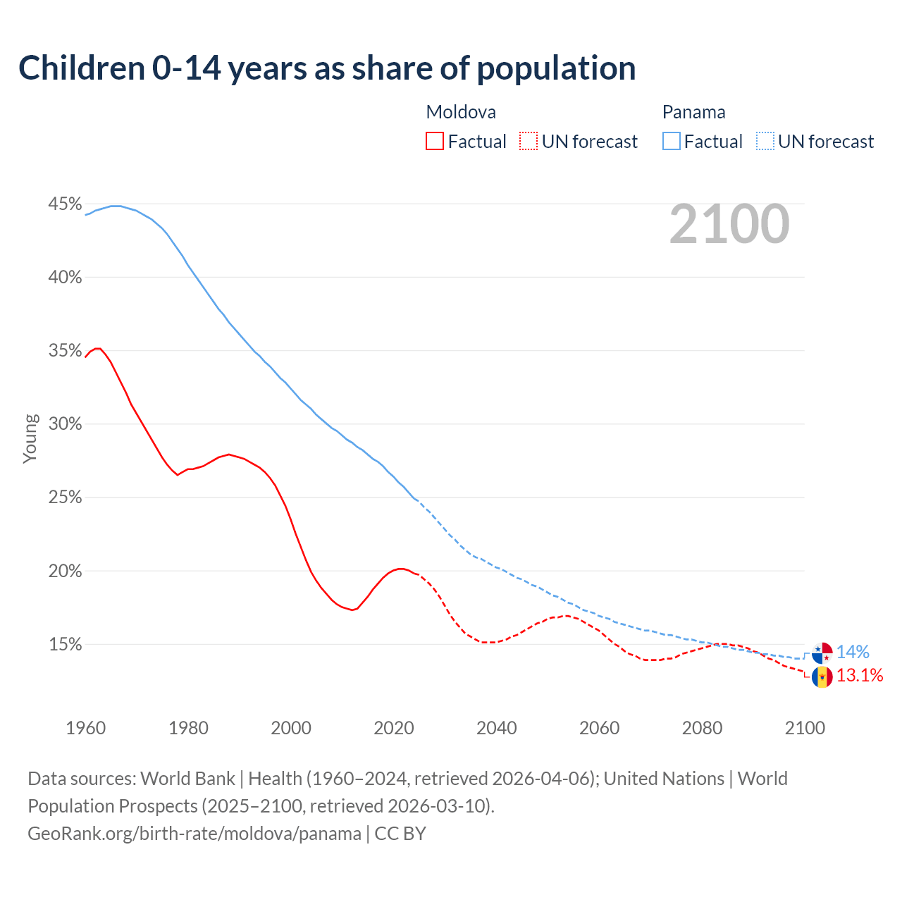 According to the latest available data on birth rates, the fertility rate in Moldova was 1.73 children per woman in 2023, compared to 2.12 in Panama in 2023. The replacement level is considered to be 2.1 children per woman.