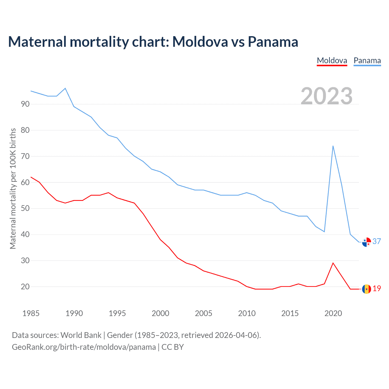 The maternal mortality rate, which is the probability of dying during childbirth or within 42 days of pregnancy termination, is 19 deaths per 100,000 live births in Moldova, compared to 37 deaths in Panama.