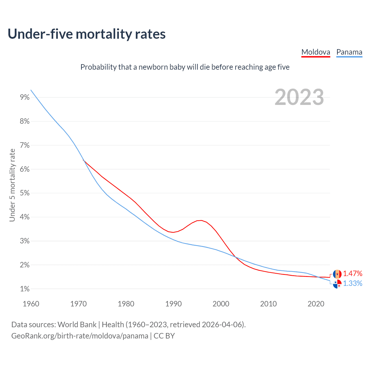 The chance that a newborn baby will die before reaching age five is 1.47% in Moldova and 1.33% in Panama. Above is a chart with historical data on under-five mortality rates.