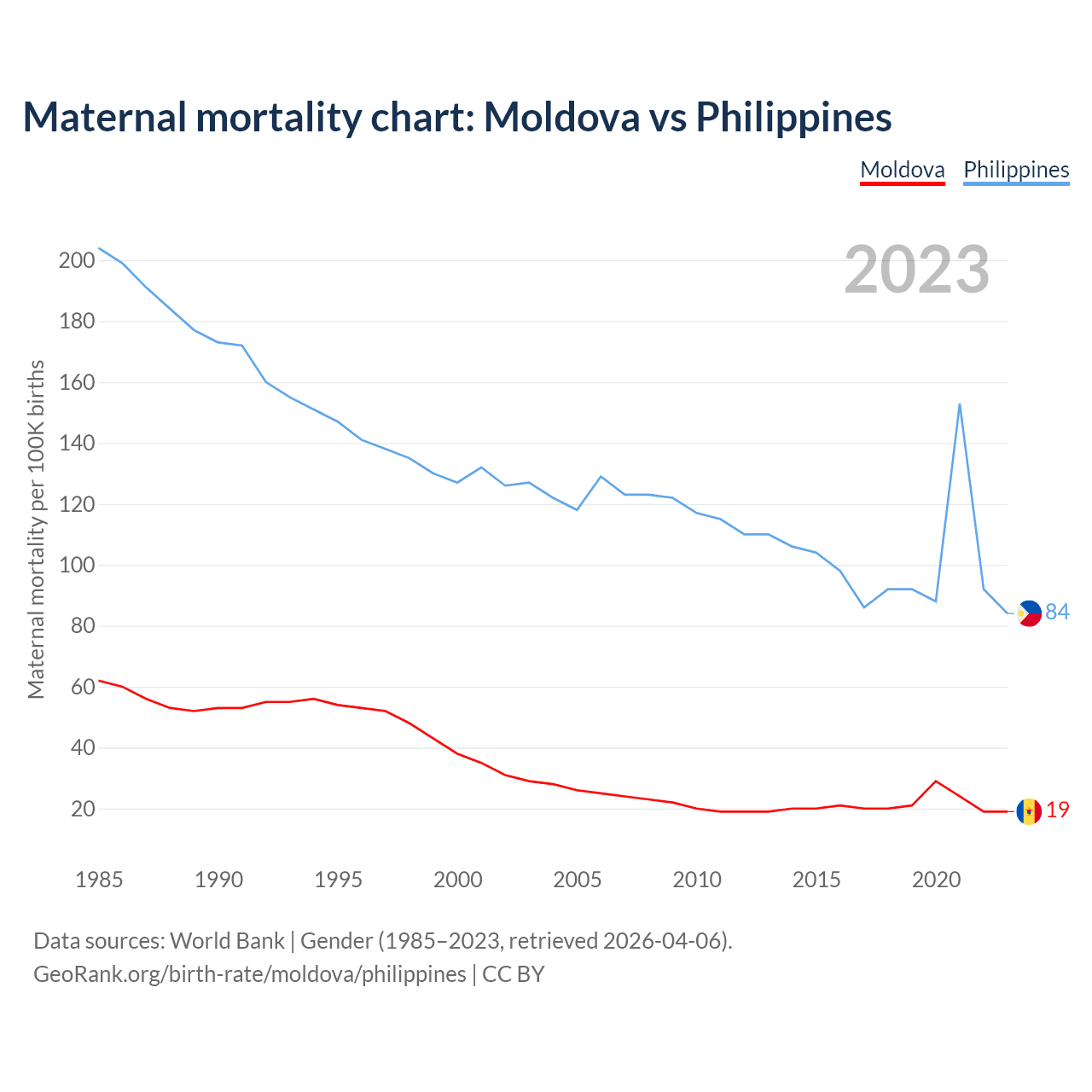The maternal mortality rate, which is the probability of dying during childbirth or within 42 days of pregnancy termination, is 19 deaths per 100,000 live births in Moldova, compared to 84 deaths in the Philippines.