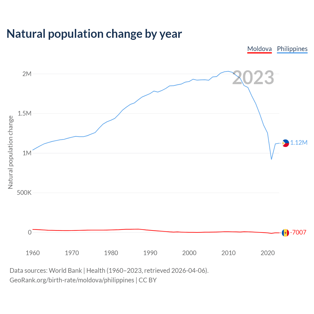 According to the latest available data on birth rates, the fertility rate in Moldova was 1.73 children per woman in 2023, compared to 1.92 in the Philippines in 2023. The replacement level is considered to be 2.1 children per woman.