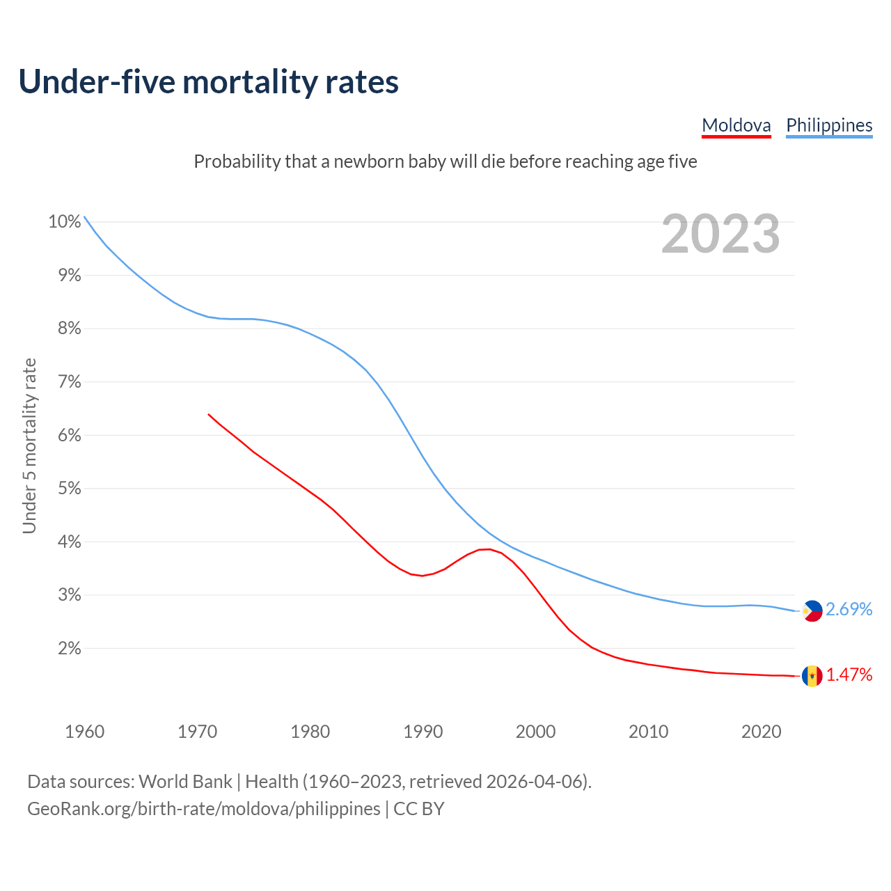 The chance that a newborn baby will die before reaching age five is 1.47% in Moldova and 2.69% in the Philippines. Above is a chart with historical data on under-five mortality rates.