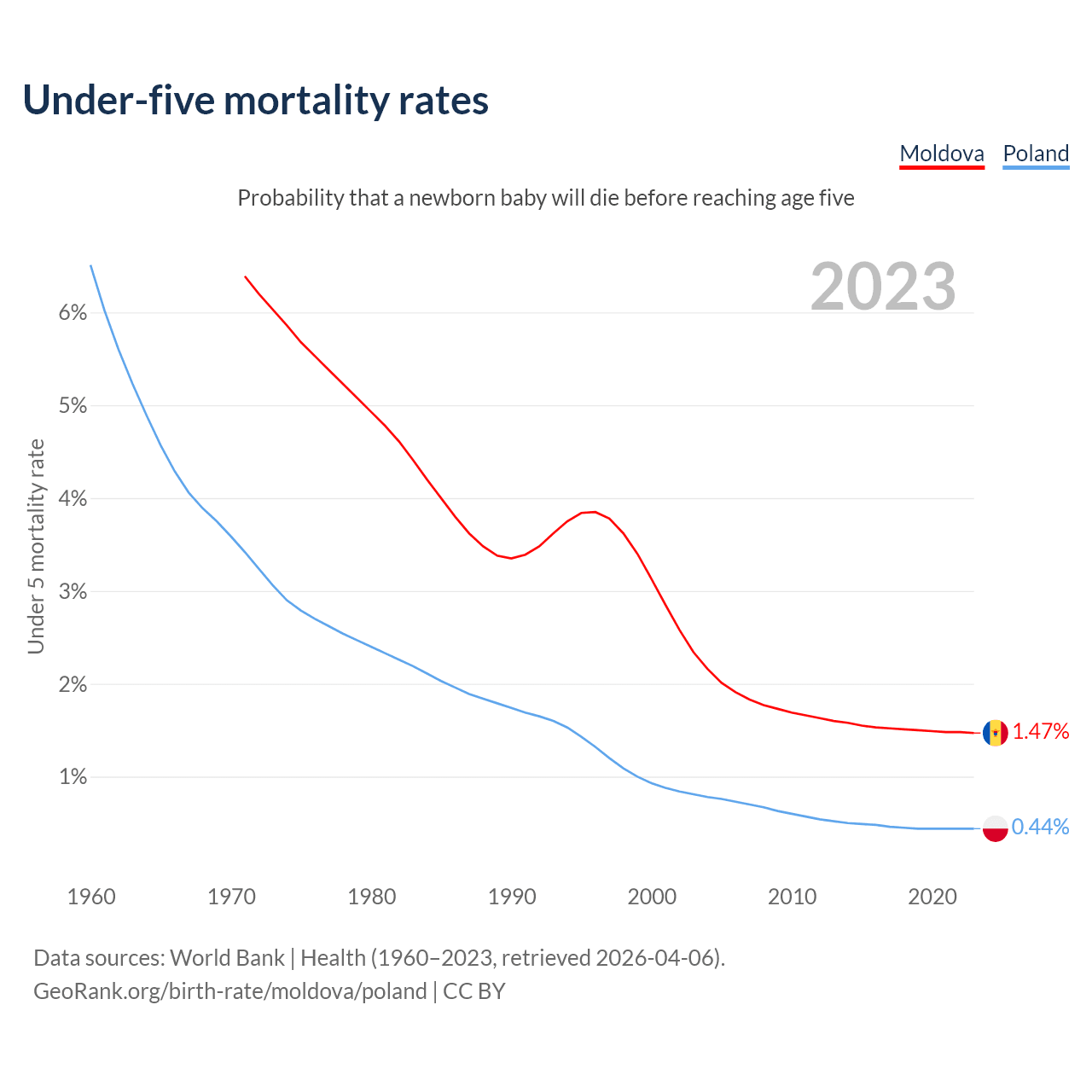 The chance that a newborn baby will die before reaching age five is 1.47% in Moldova and 0.44% in Poland. Above is a chart with historical data on under-five mortality rates.