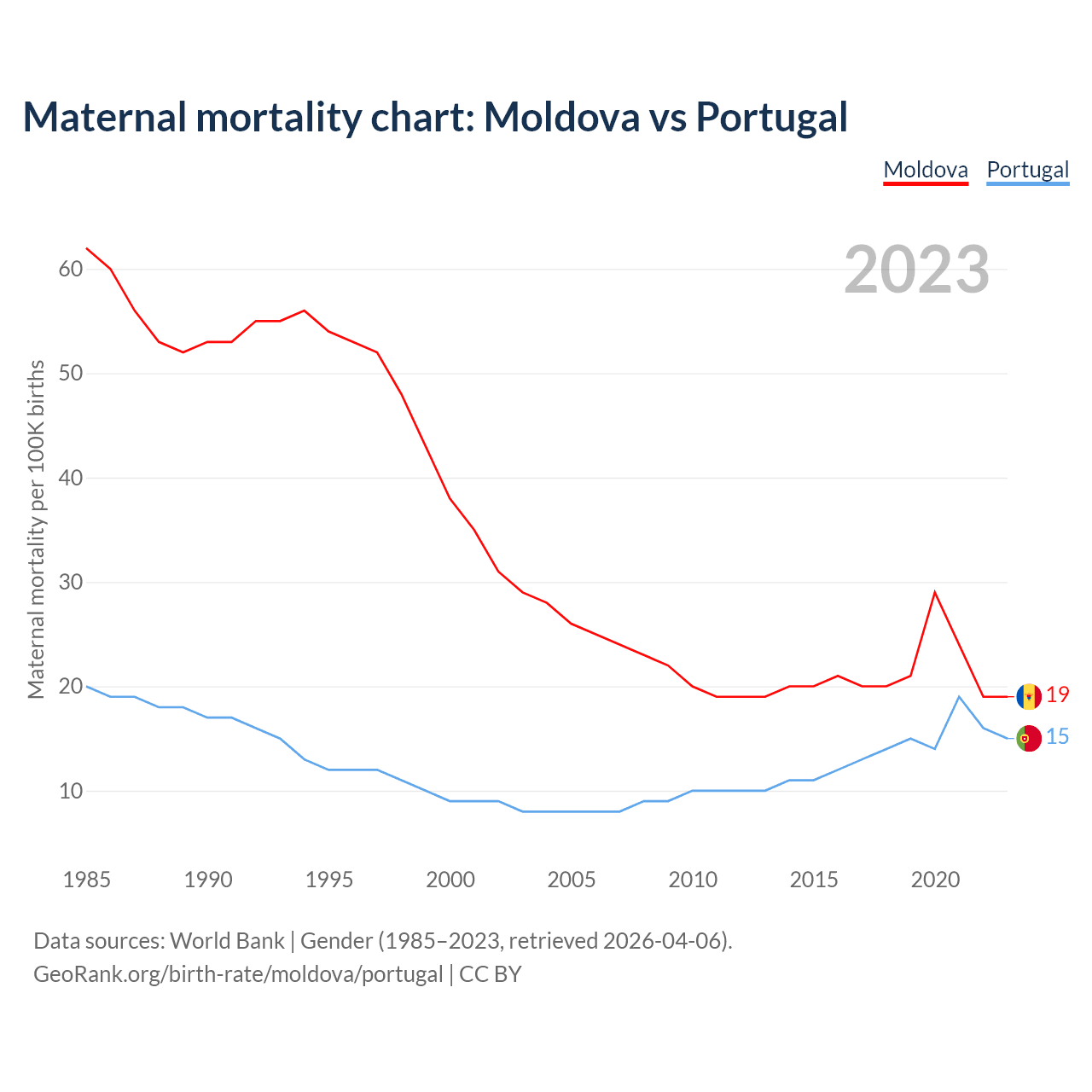 The maternal mortality rate, which is the probability of dying during childbirth or within 42 days of pregnancy termination, is 19 deaths per 100,000 live births in Moldova, compared to 15 deaths in Portugal.