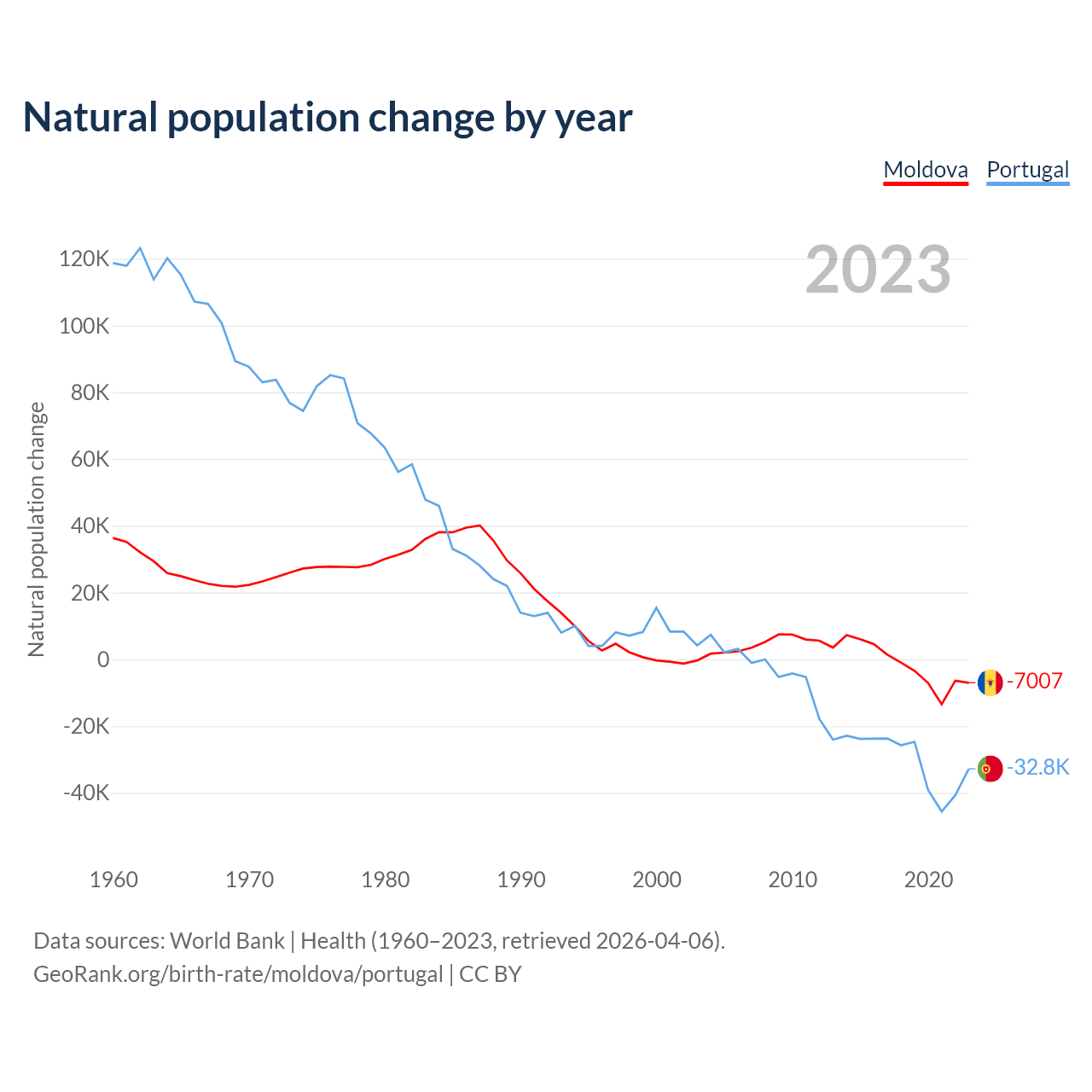 1960 vs 2023, the fertility rate has decreased by 47.8% in Moldova and by 54.4% in Portugal — in 1960, it was 3.32 and 3.16, respectively.