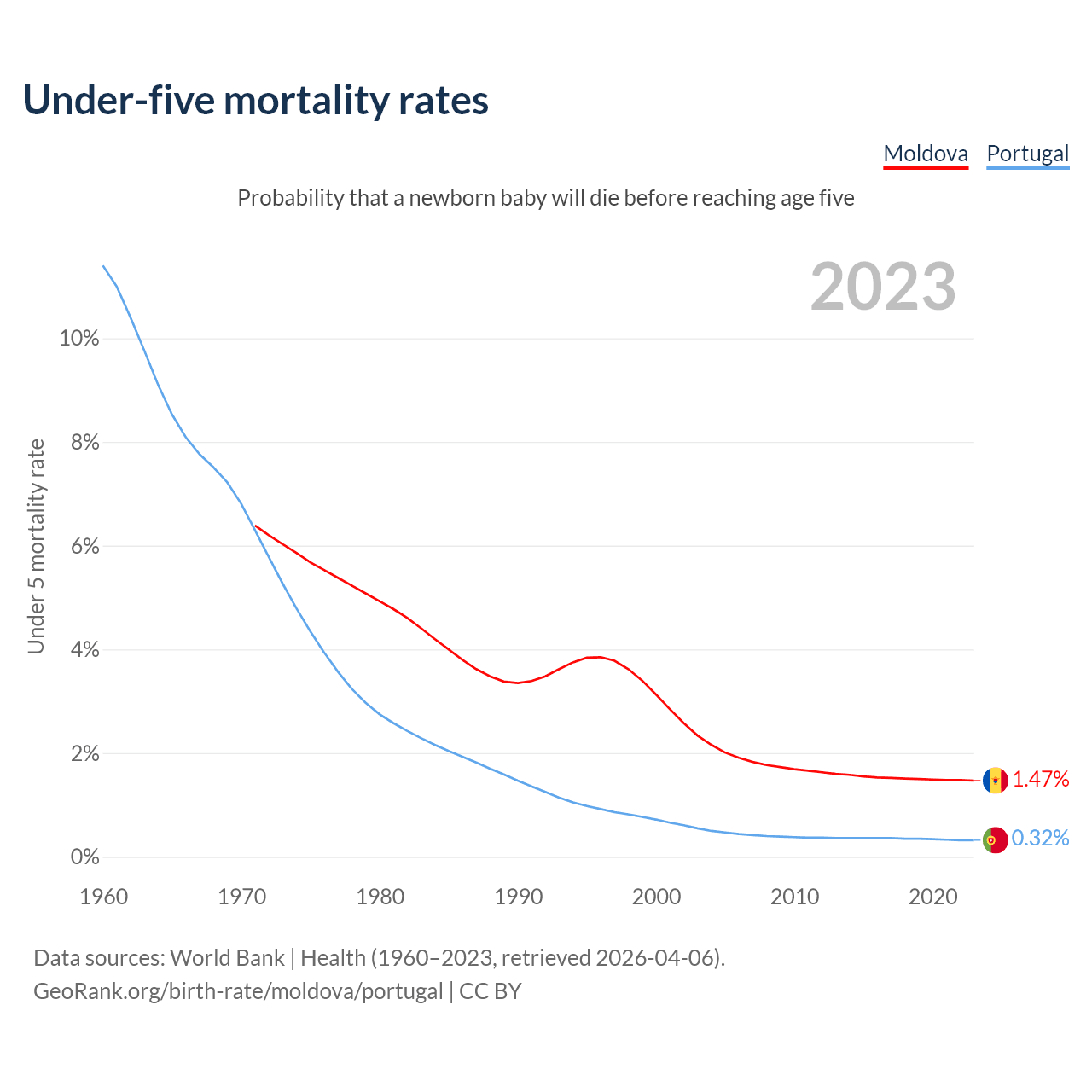 The chance that a newborn baby will die before reaching age five is 1.47% in Moldova and 0.32% in Portugal. Above is a chart with historical data on under-five mortality rates.