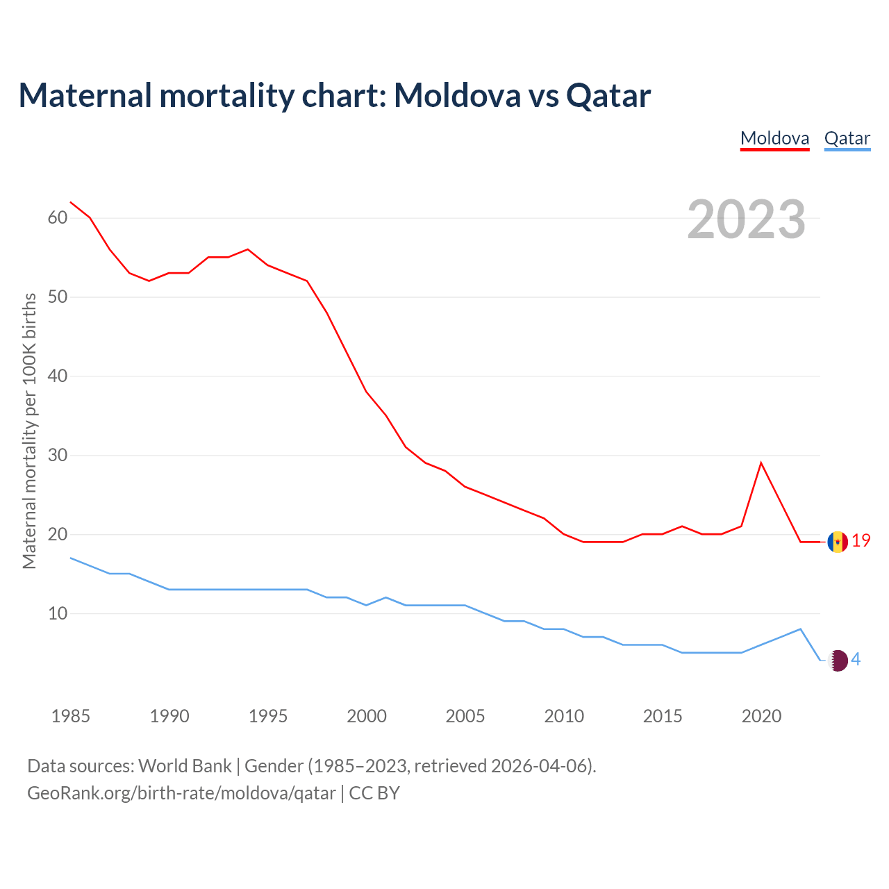 The maternal mortality rate, which is the probability of dying during childbirth or within 42 days of pregnancy termination, is 19 deaths per 100,000 live births in Moldova, compared to 4 deaths in Qatar.