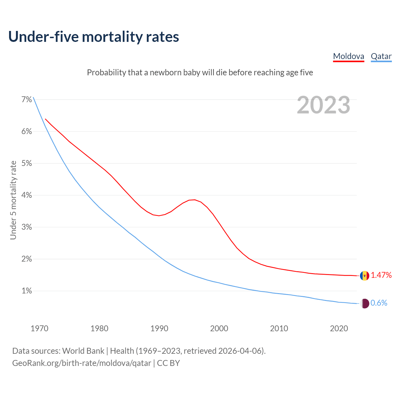 The chance that a newborn baby will die before reaching age five is 1.47% in Moldova and 0.6% in Qatar. Above is a chart with historical data on under-five mortality rates.