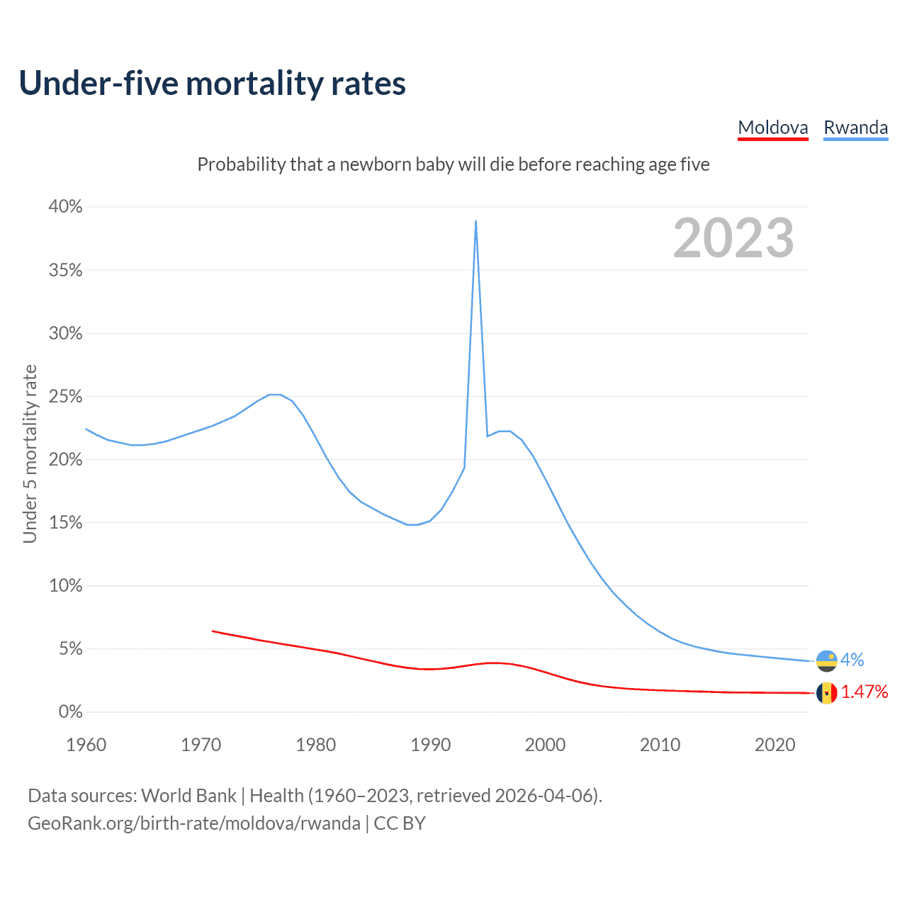 The chance that a newborn baby will die before reaching age five is 1.47% in Moldova and 4% in Rwanda. Above is a chart with historical data on under-five mortality rates.