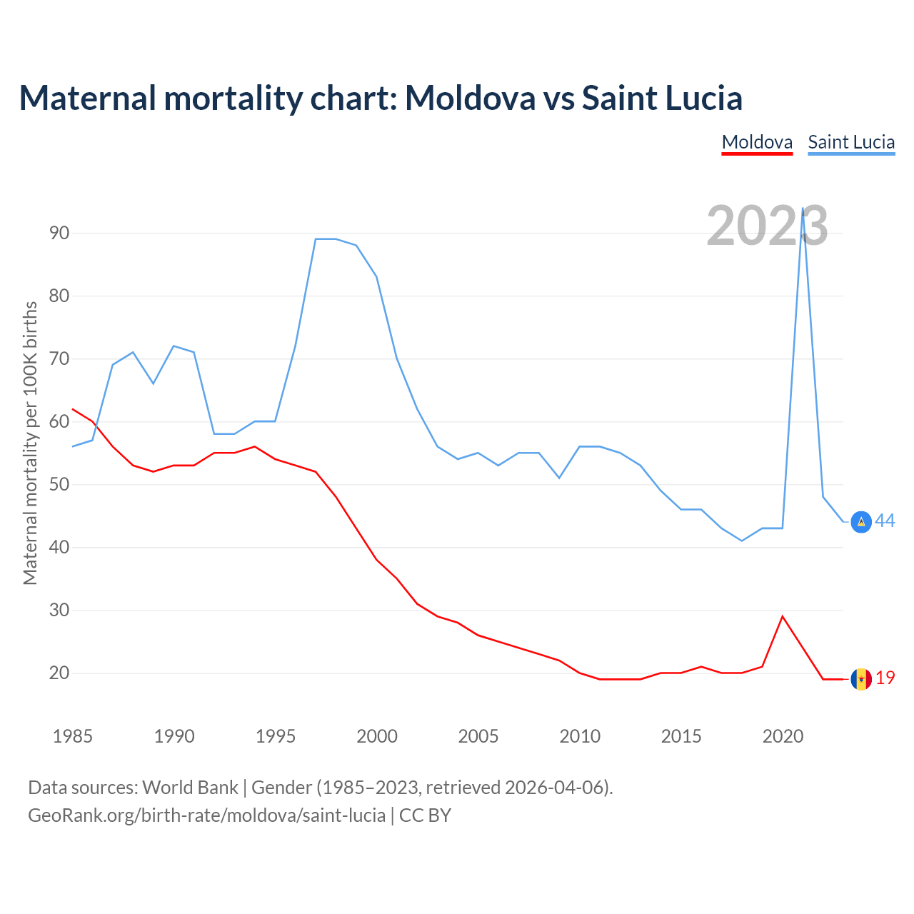 The maternal mortality rate, which is the probability of dying during childbirth or within 42 days of pregnancy termination, is 19 deaths per 100,000 live births in Moldova, compared to 44 deaths in Saint Lucia.