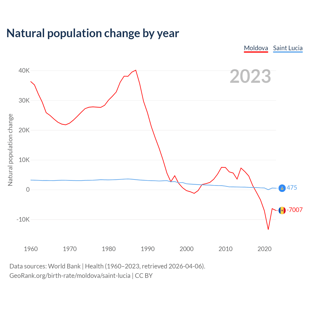 - Moldova is ranked 138/196 by birth rate compared to 123/196 for Saint Lucia.