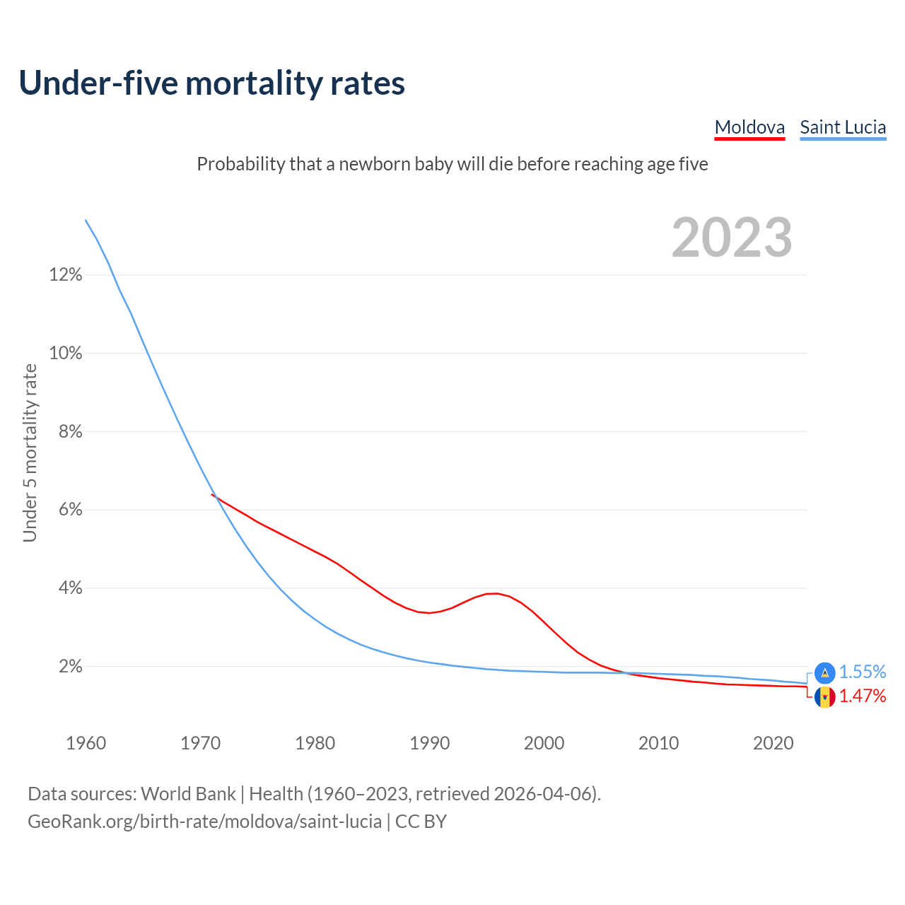 The chance that a newborn baby will die before reaching age five is 1.47% in Moldova and 1.55% in Saint Lucia. Above is a chart with historical data on under-five mortality rates.
