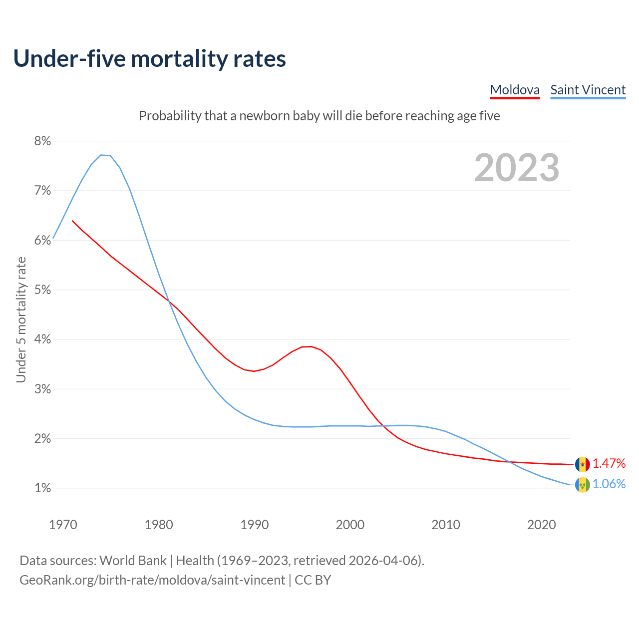 The chance that a newborn baby will die before reaching age five is 1.47% in Moldova and 1.06% in Saint Vincent. Above is a chart with historical data on under-five mortality rates.