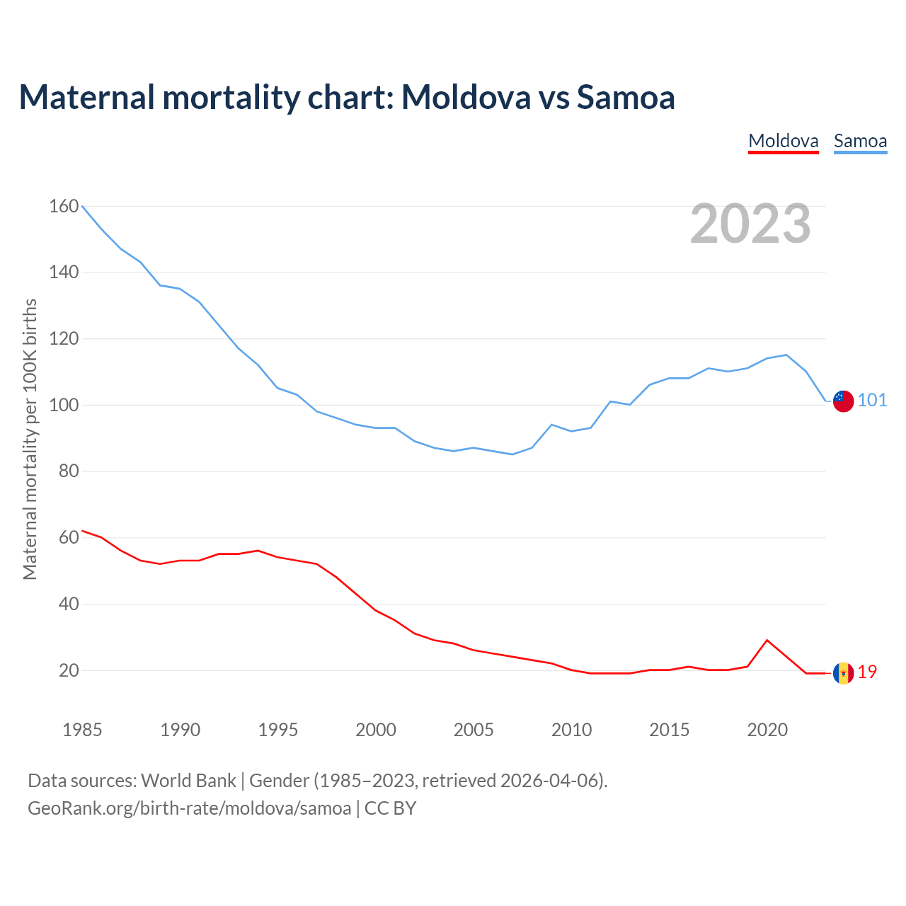 The maternal mortality rate, which is the probability of dying during childbirth or within 42 days of pregnancy termination, is 19 deaths per 100,000 live births in Moldova, compared to 101 deaths in Samoa.