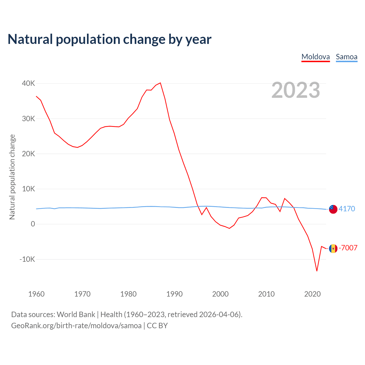 Moldova has an annual birth rate of 10.8 births per 1,000 people, compared to 25.4 for Samoa. The average number of children a woman is expected to have during her lifetime — the fertility rate, is 1.73 in Moldova and 3.83 in Samoa — 121.2% difference.