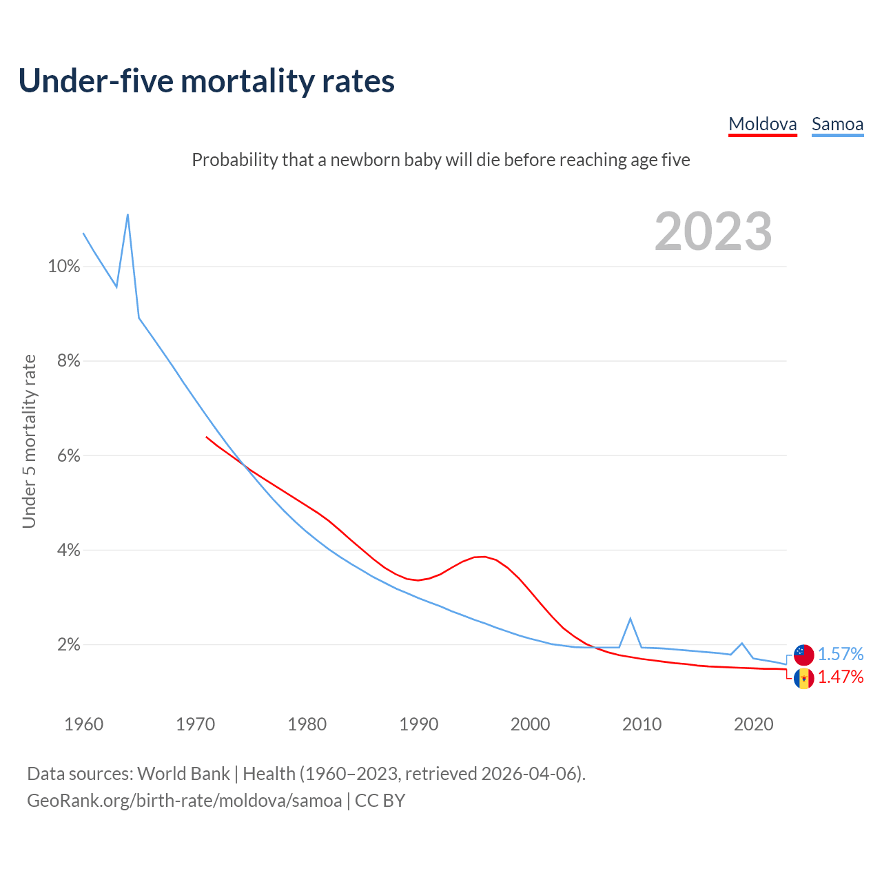 The chance that a newborn baby will die before reaching age five is 1.47% in Moldova and 1.57% in Samoa. Above is a chart with historical data on under-five mortality rates.