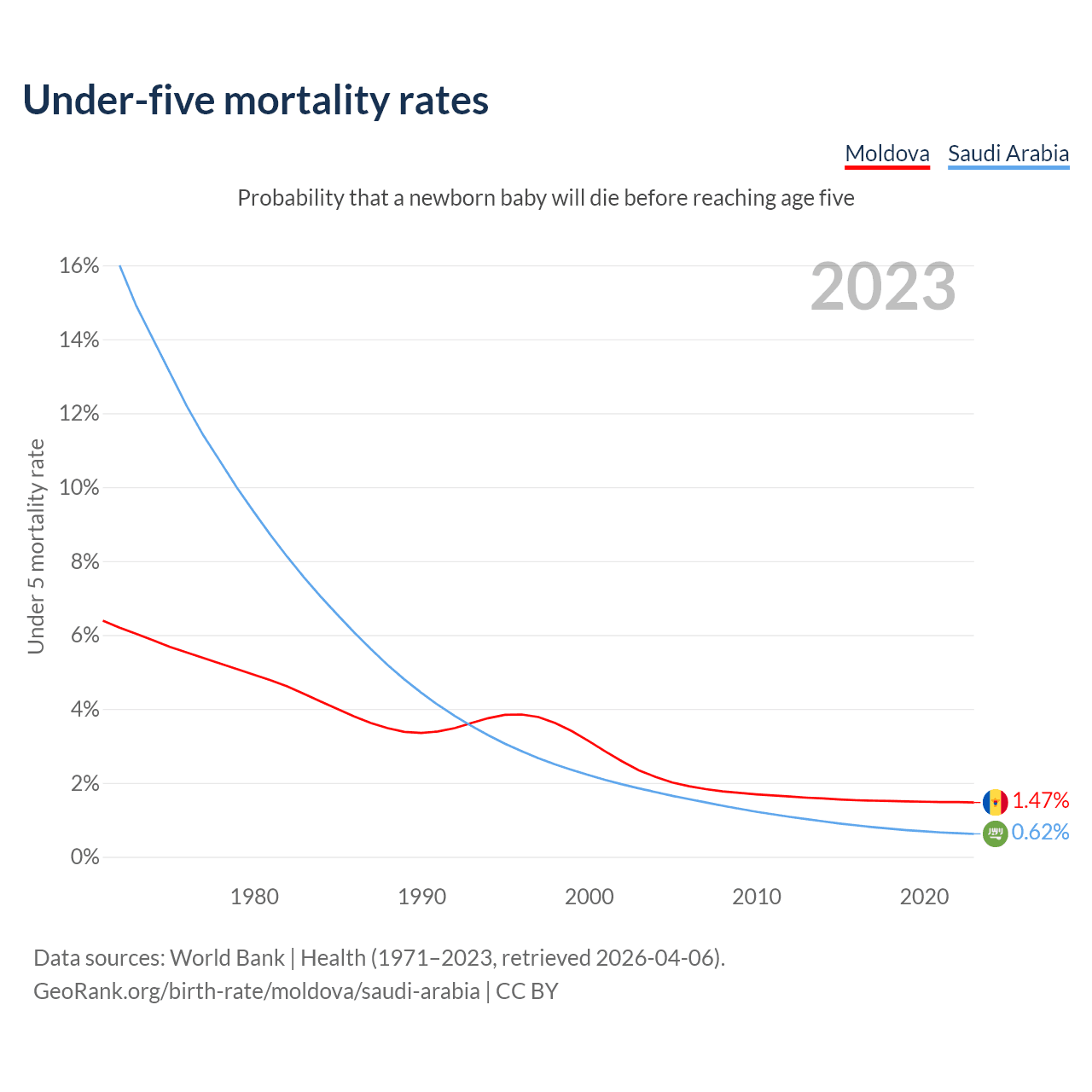 The chance that a newborn baby will die before reaching age five is 1.47% in Moldova and 0.62% in Saudi Arabia. Above is a chart with historical data on under-five mortality rates.