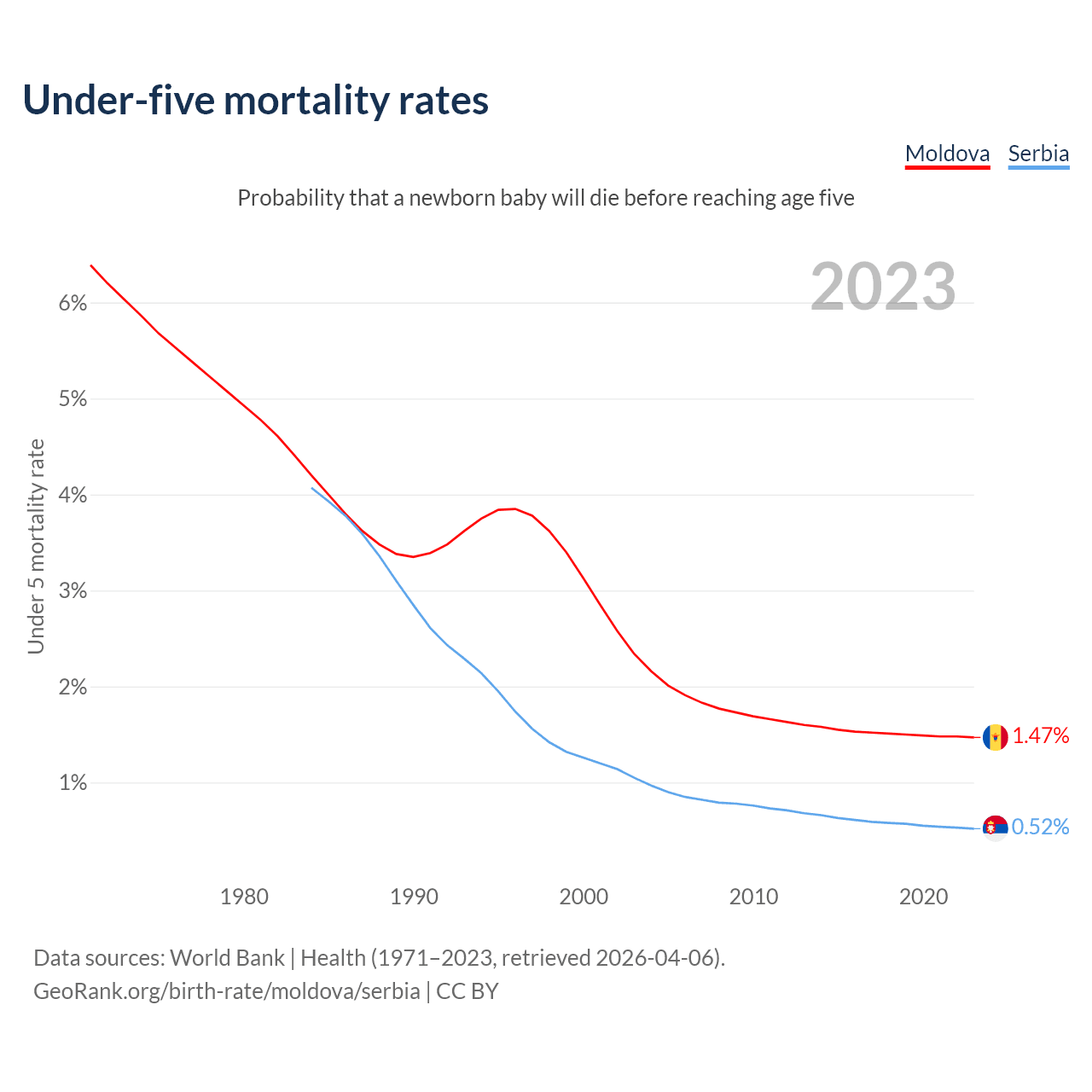 The chance that a newborn baby will die before reaching age five is 1.47% in Moldova and 0.52% in Serbia. Above is a chart with historical data on under-five mortality rates.