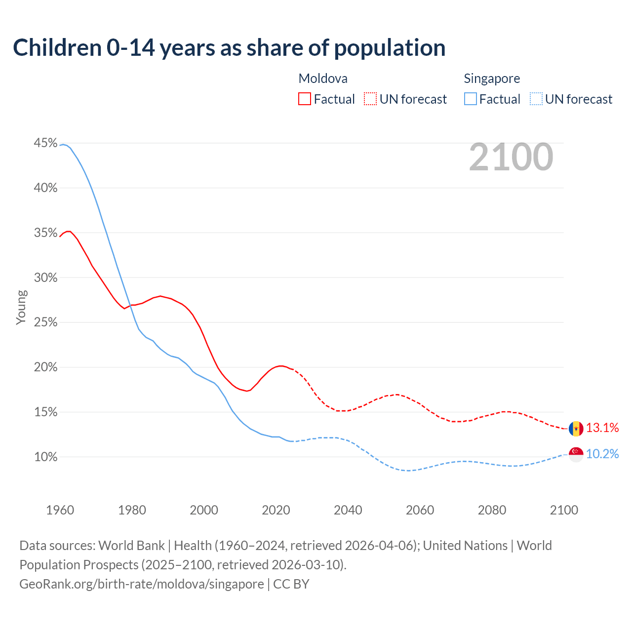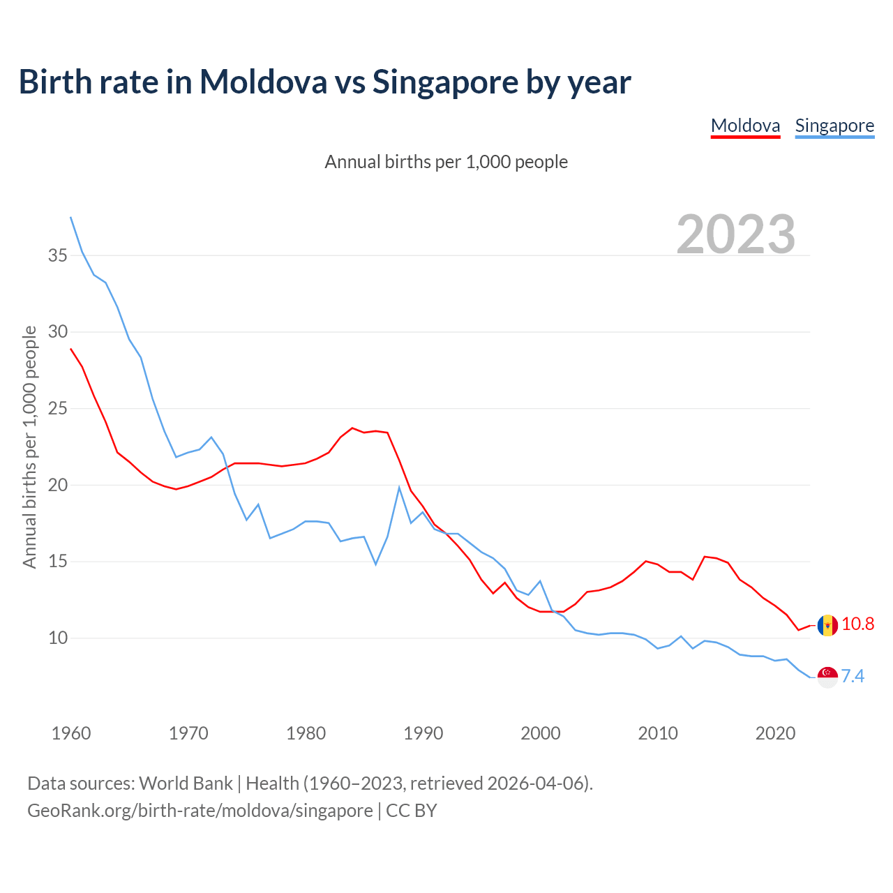 According to the latest available data on birth rates, the fertility rate in Moldova was 1.73 children per woman in 2023, compared to 0.97 in Singapore in 2023. The replacement level is considered to be 2.1 children per woman.