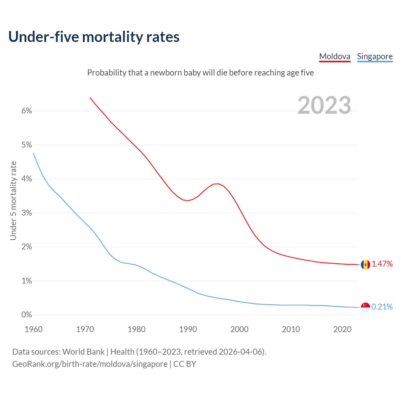 The chance that a newborn baby will die before reaching age five is 1.47% in Moldova and 0.21% in Singapore. Above is a chart with historical data on under-five mortality rates.