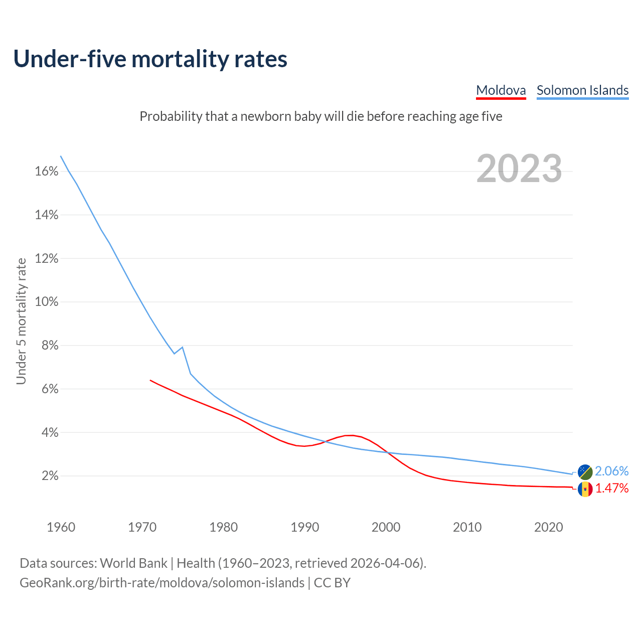 The chance that a newborn baby will die before reaching age five is 1.47% in Moldova and 2.06% in the Solomon Islands. Above is a chart with historical data on under-five mortality rates.