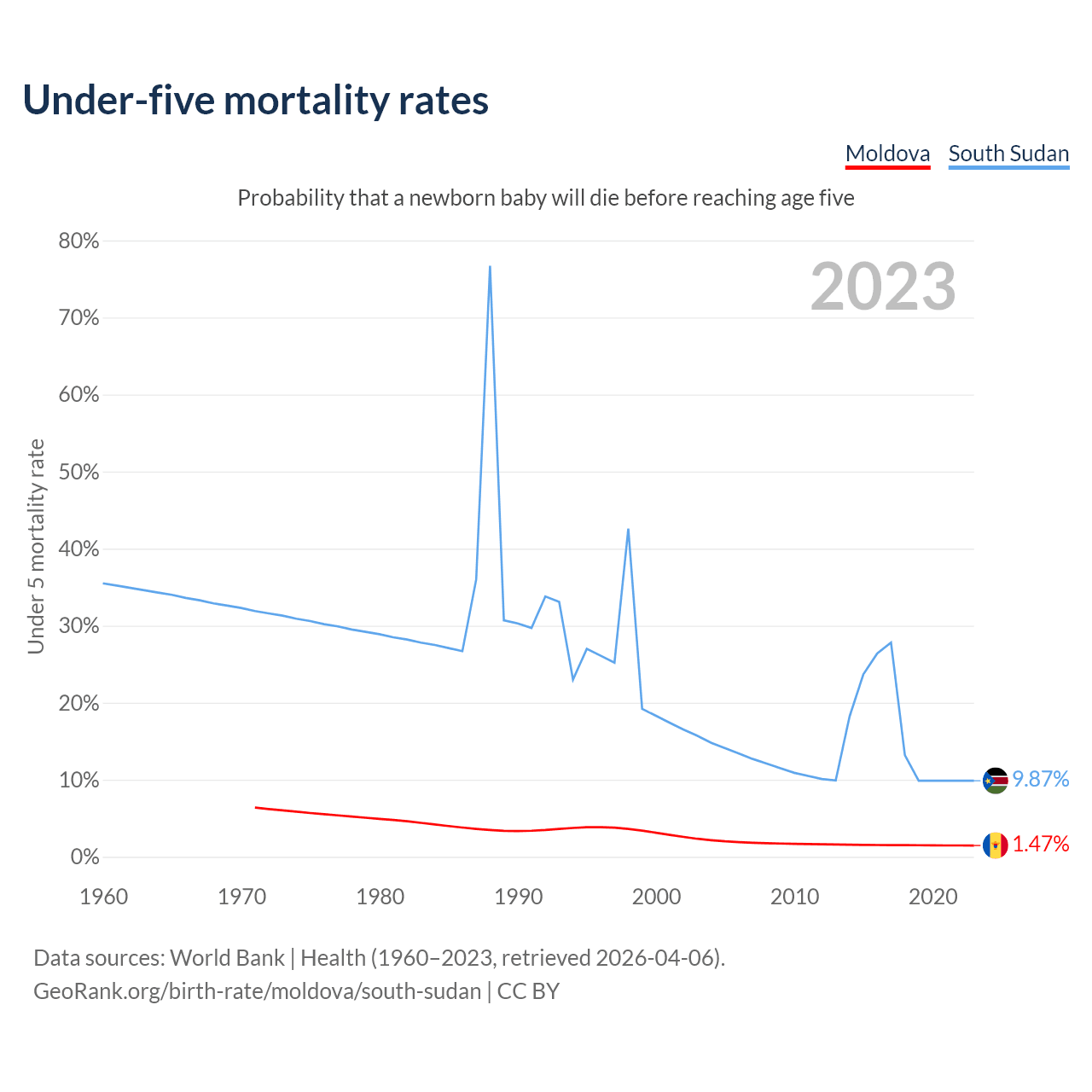 The chance that a newborn baby will die before reaching age five is 1.47% in Moldova and 9.87% in South Sudan. Above is a chart with historical data on under-five mortality rates.
