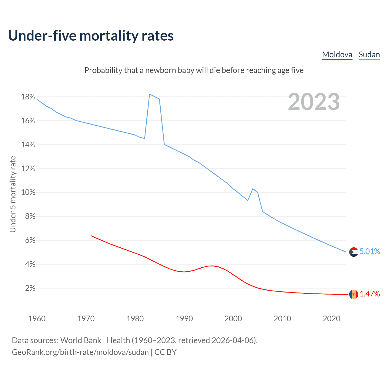 The chance that a newborn baby will die before reaching age five is 1.47% in Moldova and 5.01% in Sudan. Above is a chart with historical data on under-five mortality rates.