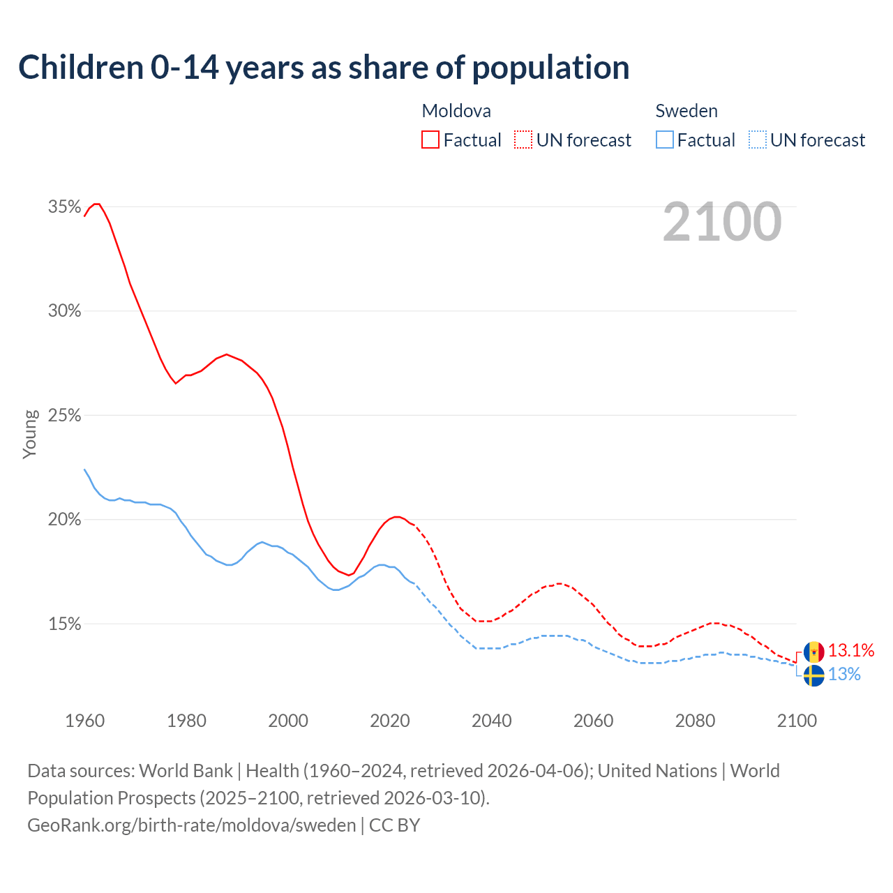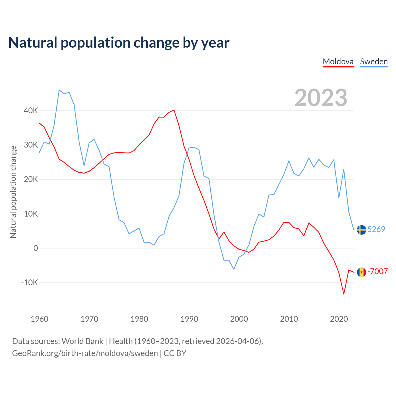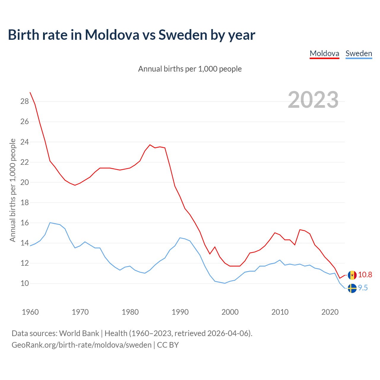 According to the latest available data on birth rates, the fertility rate in Moldova was 1.73 children per woman in 2023, compared to 1.45 in Sweden in 2023. The replacement level is considered to be 2.1 children per woman.