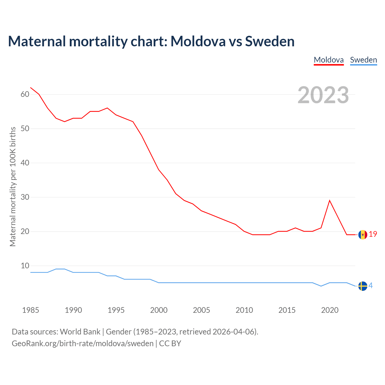 The maternal mortality rate, which is the probability of dying during childbirth or within 42 days of pregnancy termination, is 19 deaths per 100,000 live births in Moldova, compared to 4 deaths in Sweden.