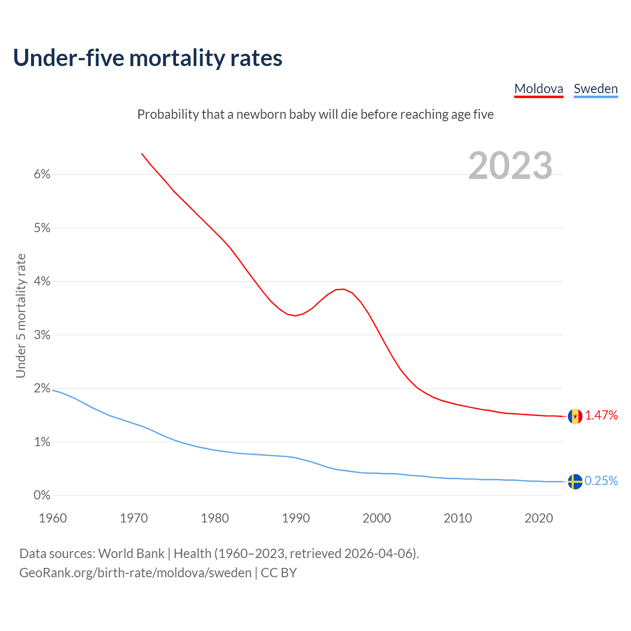 The chance that a newborn baby will die before reaching age five is 1.47% in Moldova and 0.25% in Sweden. Above is a chart with historical data on under-five mortality rates.
