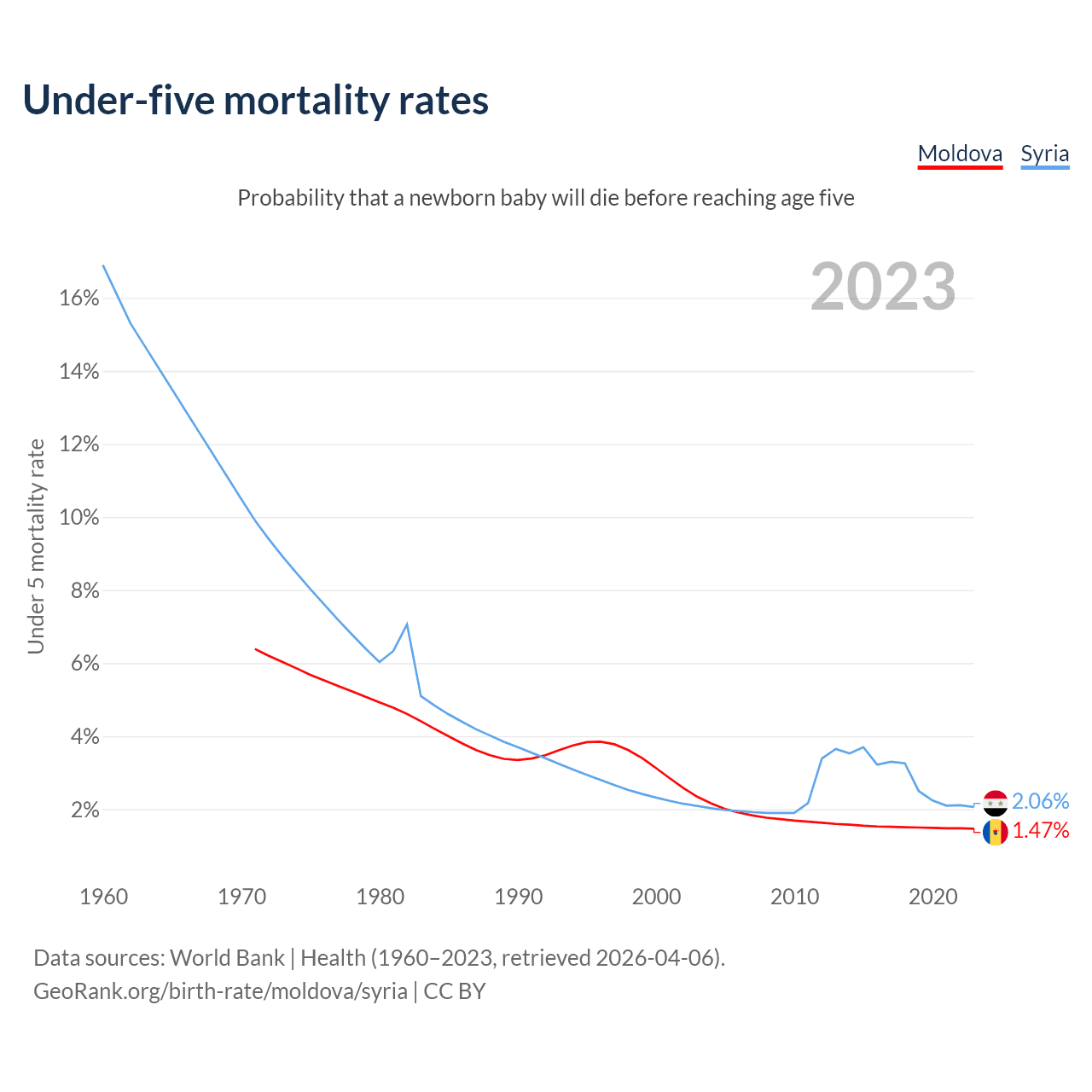 The chance that a newborn baby will die before reaching age five is 1.47% in Moldova and 2.06% in Syria. Above is a chart with historical data on under-five mortality rates.