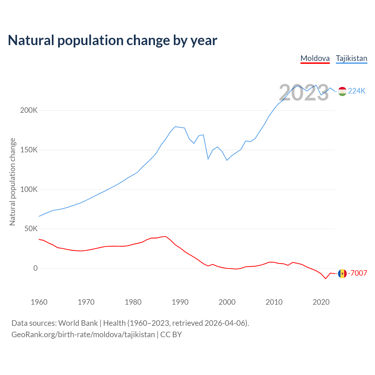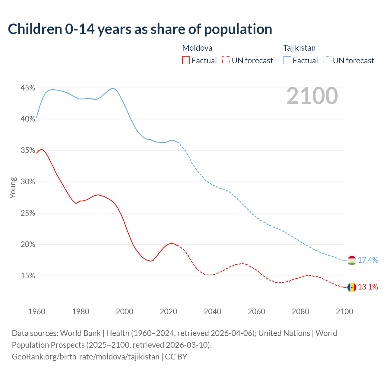 According to the latest available data on birth rates, the fertility rate in Moldova was 1.73 children per woman in 2023, compared to 3.07 in Tajikistan in 2023. The replacement level is considered to be 2.1 children per woman.