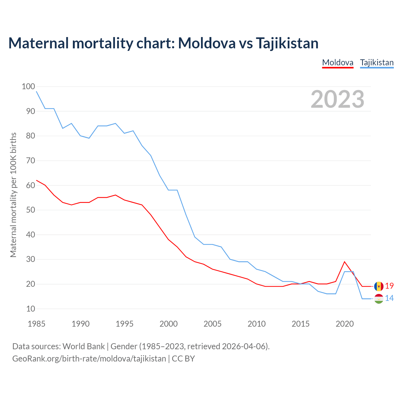 The maternal mortality rate, which is the probability of dying during childbirth or within 42 days of pregnancy termination, is 19 deaths per 100,000 live births in Moldova, compared to 14 deaths in Tajikistan.